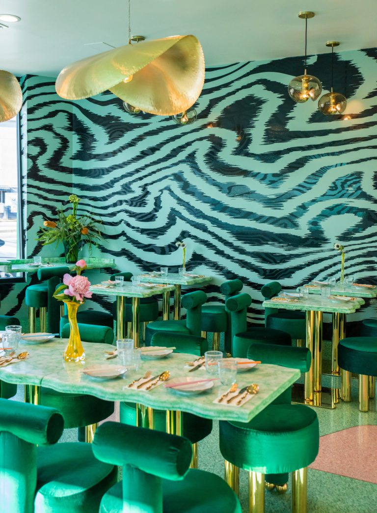 Our Heartwood Collection, made in collaboration with Humberto Leon, is featured in the photos above wrapping the entire restaurant in a custom color.