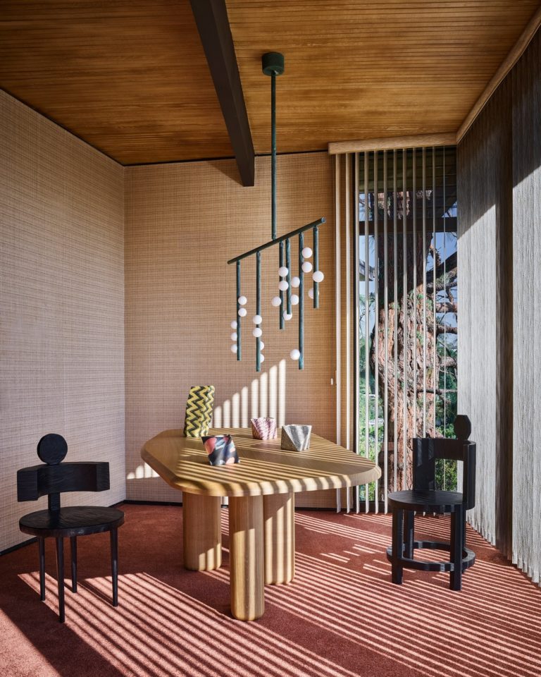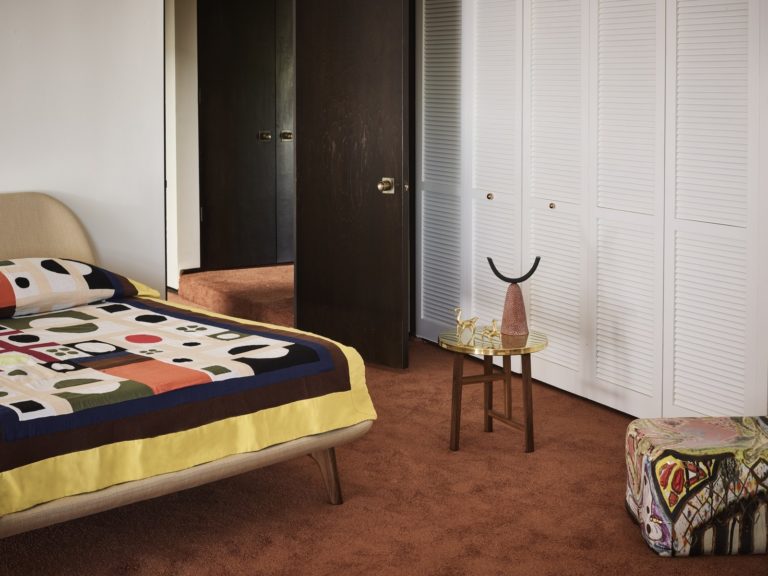 “You walk into something like this, and you see a Jacuzzi tub like that, and you’re having a hard time peeling your chin off the floor,” he says, gesturing toward the sunken-tiled Roman tub in the master bathroom, now surrounded by gold-leaf Calico wallpaper and wall-to-wall carpet that is not original to the house, yet serendipitously fits right in with the original popcorn ceilings, seagrass wall treatment, and vertical blinds. “The house is really sexy, and it was a beautiful tableau to bring ourselves into.” Call it Boogie Nights chic.”