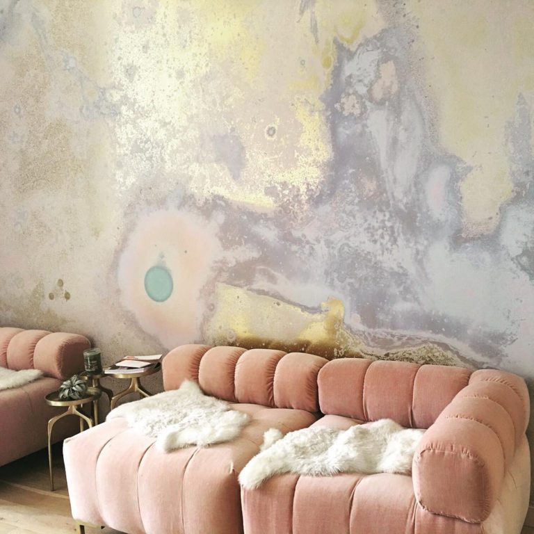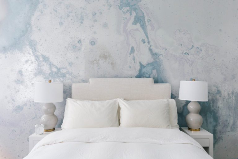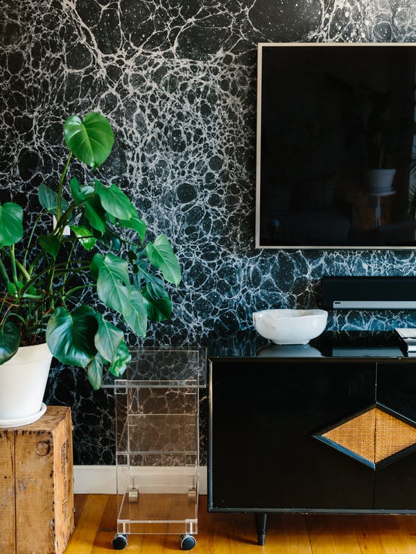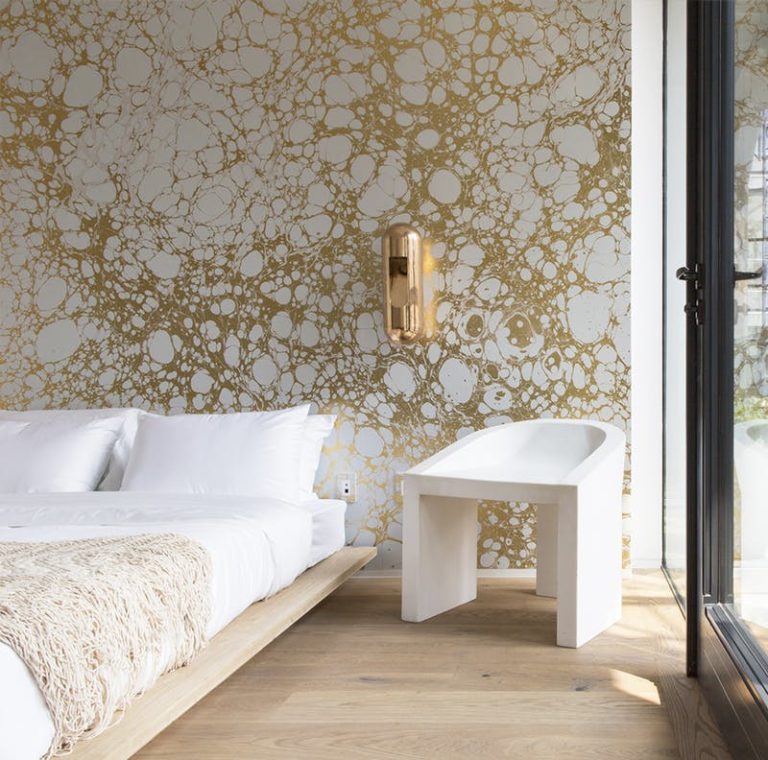 The folks at Brooklyn-based Calico Wallpaper were way out ahead of the trend towards marble wallpaper, and their designs are still some of my favorites. Their original collection includes the marbelized paper pictured above, and their Inverted Spaces Collection, featured in a couple of the rooms in the slideshow up top, has swirly, gold-and-silver touched patterns that resemble stone but also conjure up images of the heavens. These are also murals, available in custom sizes.