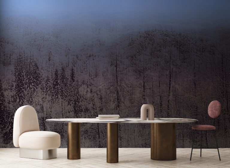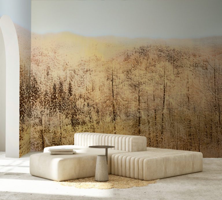 It was serendipitous, really. Rachel Cope, cofounder of Calico Wallpaper, was toying with the idea of a scenic panorama—a departure from the maker’s largely abstract and painterly collections—when an undulating forest scene on Instagram stopped her mid-scroll. Posted by Ed Ng—founder of international design and architecture firm AB Concept—the snow-capped terrain (which happens to be the view from Ng’s back porch in Karuizawa, Japan) was calling for a large-scale canvas. Lightly reinterpreted with varied perspectives and artisan finishes, the coniferous sight now dons the Tableau wallpaper, available in 8 colors allusive of the changing seasons in the Japanese Alps.