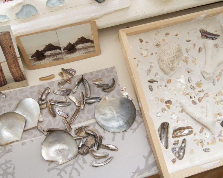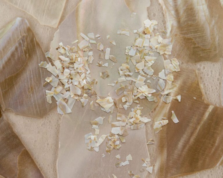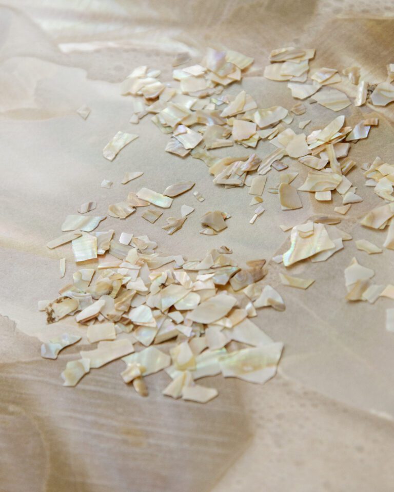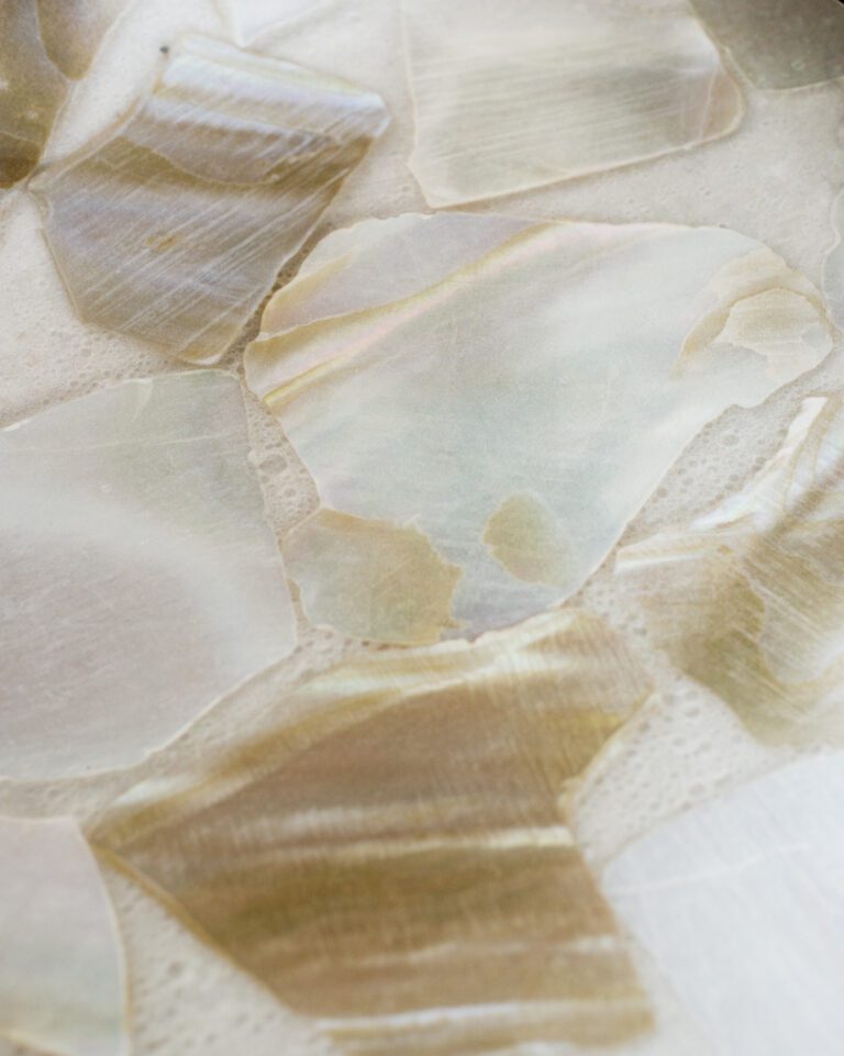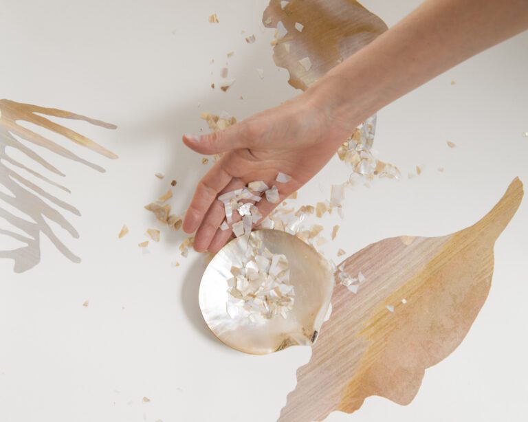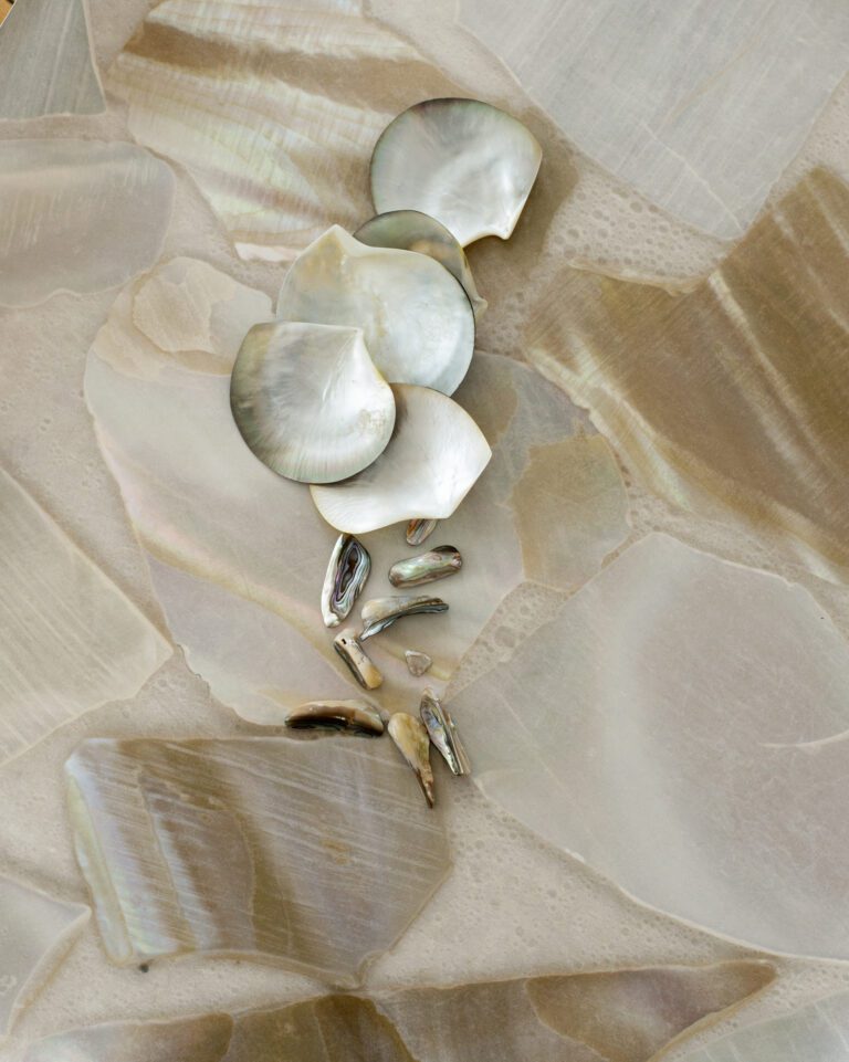 At Calico Wallpaper, we sought to capture this ephemeral beauty by working directly with nature’s materials. Using abalone shells and coral fragments, we created intricate, hand-assembled collages, layering organic textures and iridescent forms to reflect the delicate artistry of the sea. Transformed into wallpaper, these compositions preserve the movement and luminosity of their natural origins, embodying the poetry of the ocean—shells cradled in the palm, coral shifting with the currents, driftwood, seafoam, and the quiet shimmer hidden within an oyster’s depths.