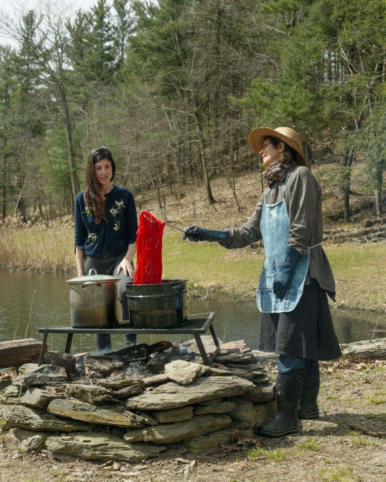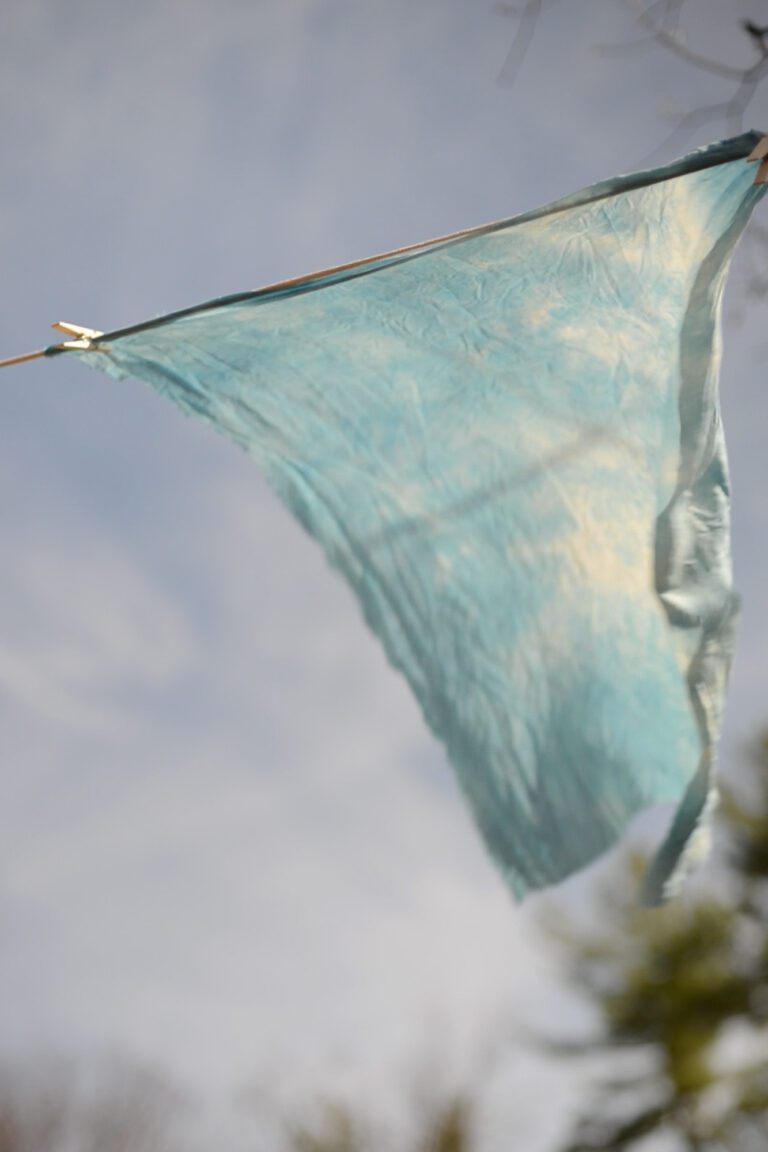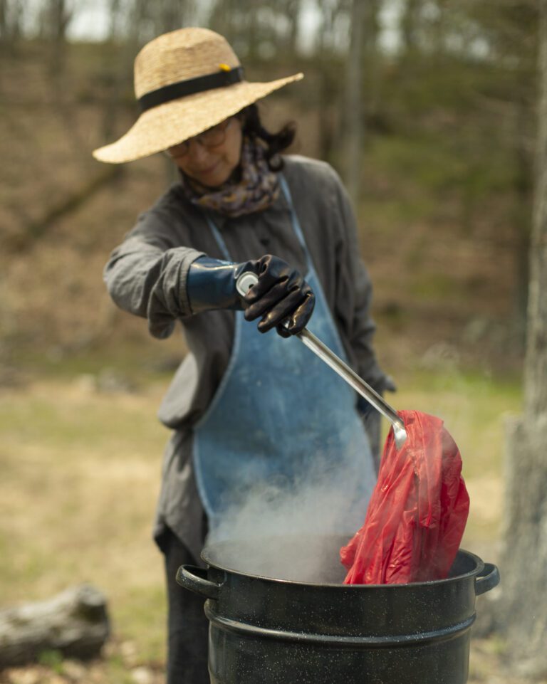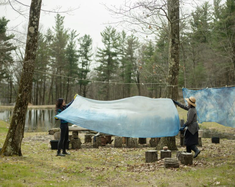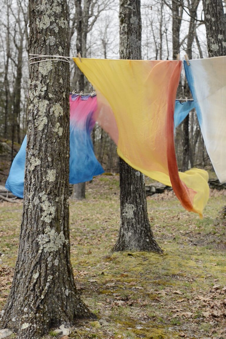For these collections we worked with Hawthorne Valley kindergarten teacher and puppet artist JW Ping, who has a long established practice of plant dye exploration. “A journey into the enchantment of color unfolds each time the fibers are lifted from the brewing vessel… Revelation of unexpected hues is the most rewarding!” Through this practice she produces extraordinary silk tapestries that are used to create fantastical realms within her theater productions, bringing stories to life through an array of color and texture. Alchemy and Enchantment transform those backdrops into immersive, all encompassing spaces, where the unique properties of natural dyes on silk are captured at a monumental scale.