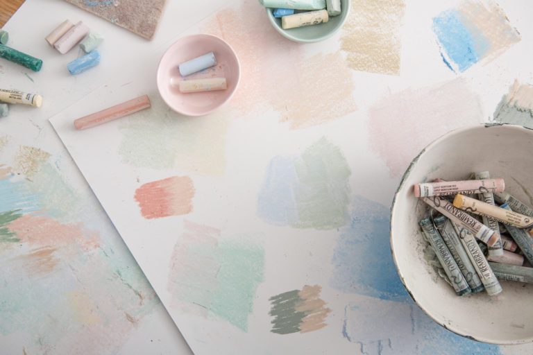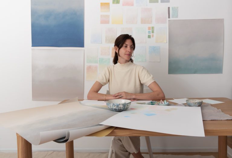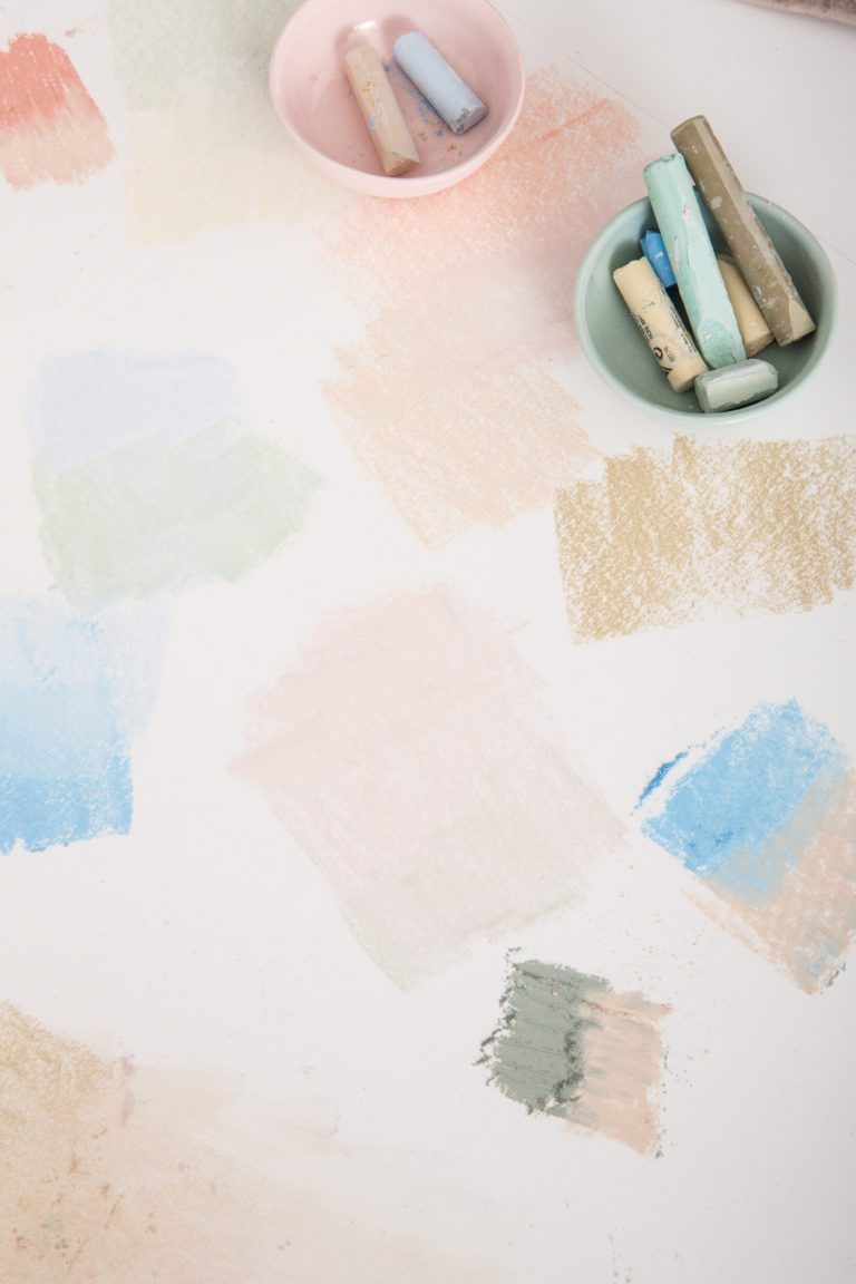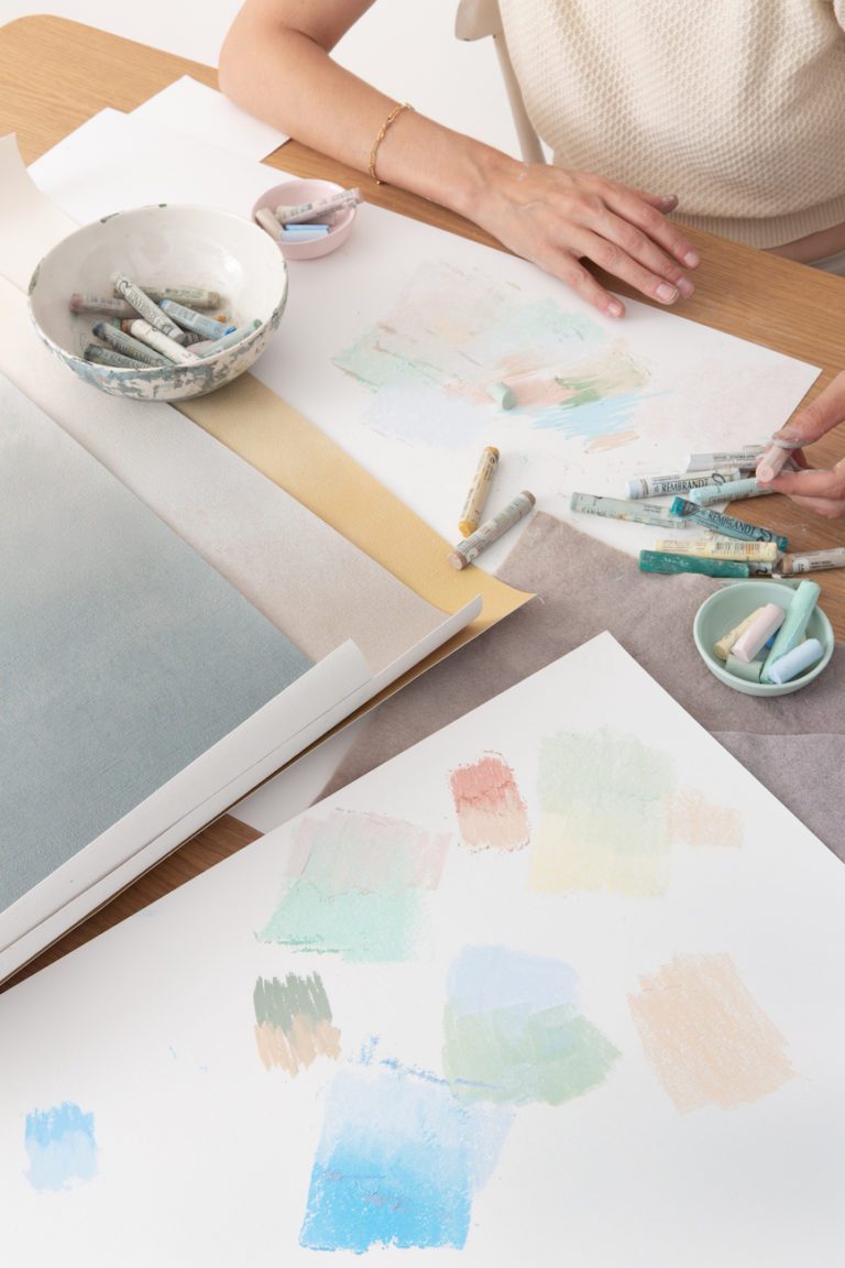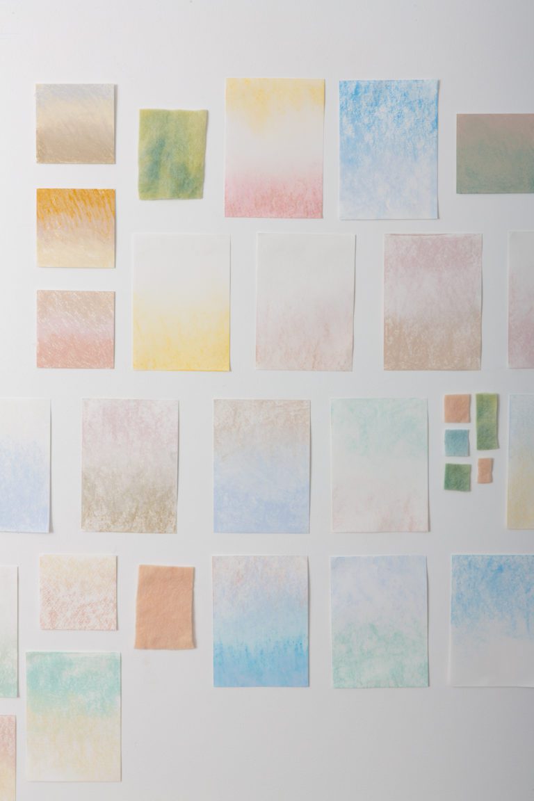 Inspired by the colors created by the diffusion of the sun’s rays on a cloudy day, we worked with washes of color to capture the effect of light emerging through suspended particles. The artwork layers chalk pastels on a texured backdrop, establishing a sense of depth through the use of muted tones. The result is a series of subtle yet impactful gradient fields that transform a room.