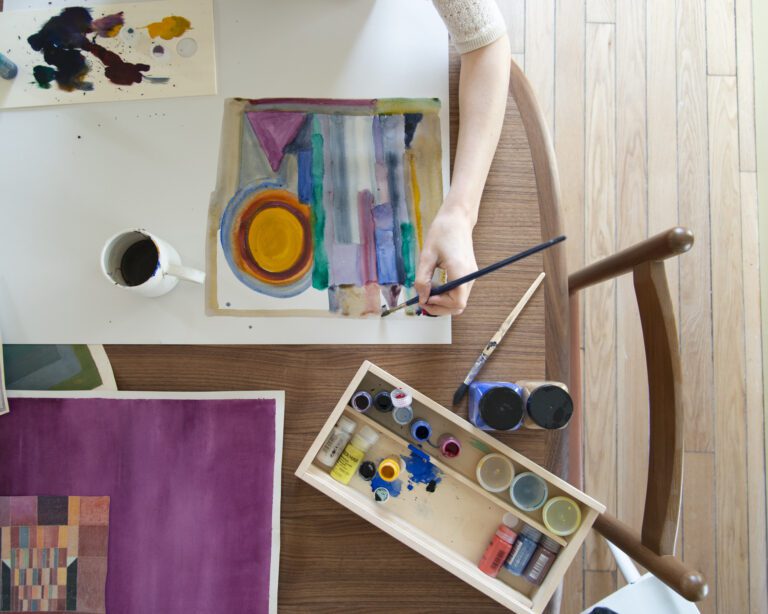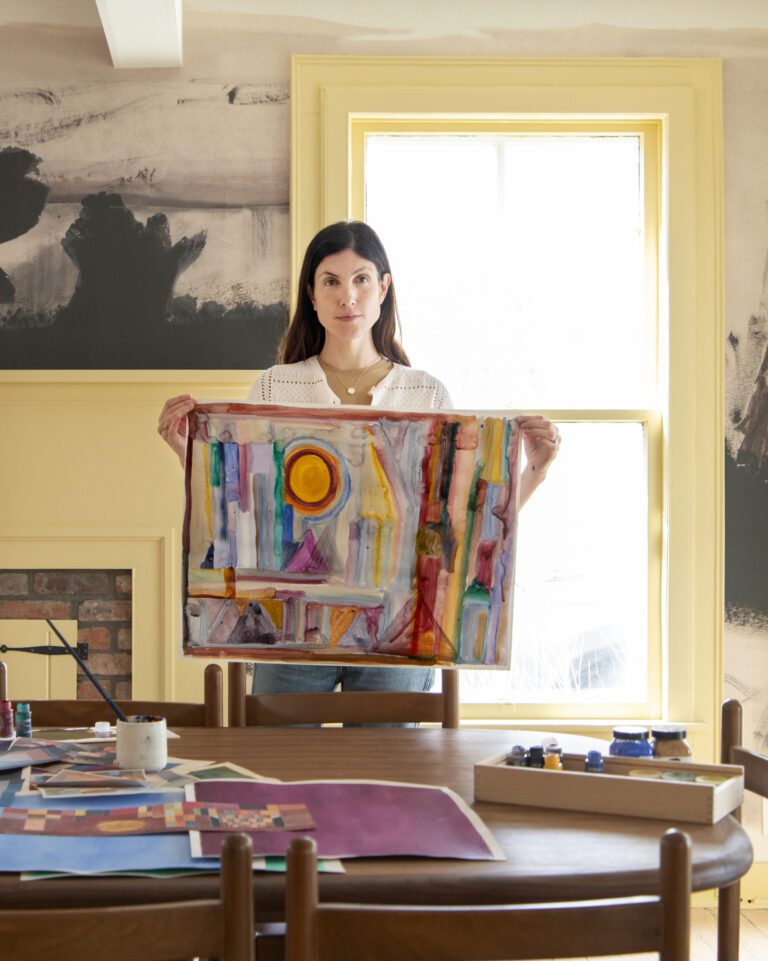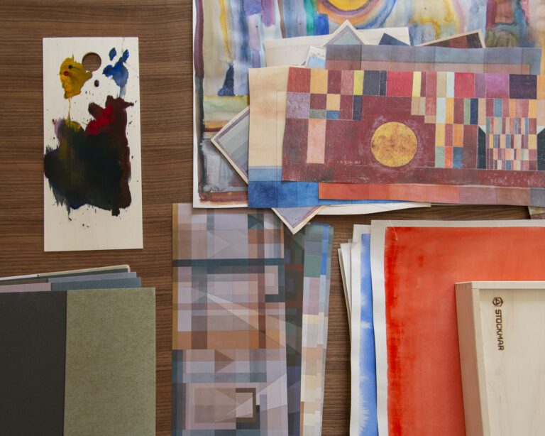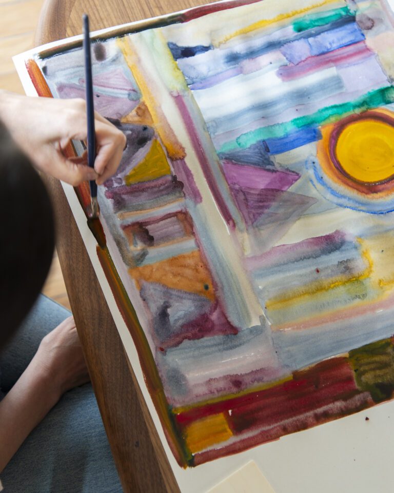 Inspired by the work of Paul Klee, who was influenced by Expressionism, Cubism, and Surrealism, Evoke is childlike and playful, paying tribute to the artist’s unique sensibility and style. Beautiful washes of color were painted on watercolor paper and then overlayed to create gorgeous tones and geometric forms. Imaginary buildings and landscapes evoke feelings through the subtle shifts in color that dance across the plane. Klee once said, “The painter should not paint what he sees, but what will be seen.”