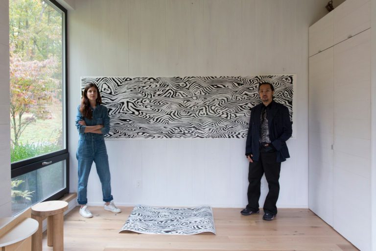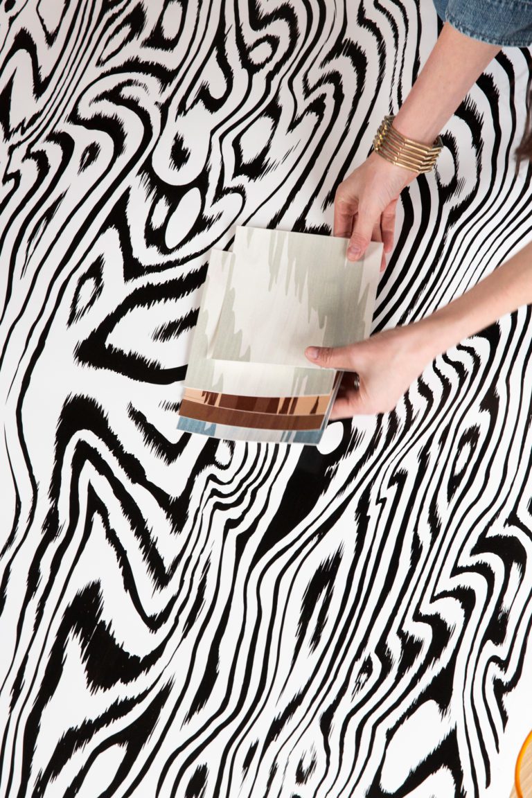 Drawing inspiration from the distinctive patterns of wood grain, Leon collaborated with Calico Wallpaper to craft a custom mural that blends the organic lines of wood’s natural grain with an exaggerated graphic pattern. Together we then further amplified the pattern’s contrasting elements by juxtaposing glistening blacks with matte sumi ink-based hues. The result is a textural interplay of iridescent highlights and warm underlying tones that combines the novelty and frisson of contemporary design with the nostalgic comforts of home.