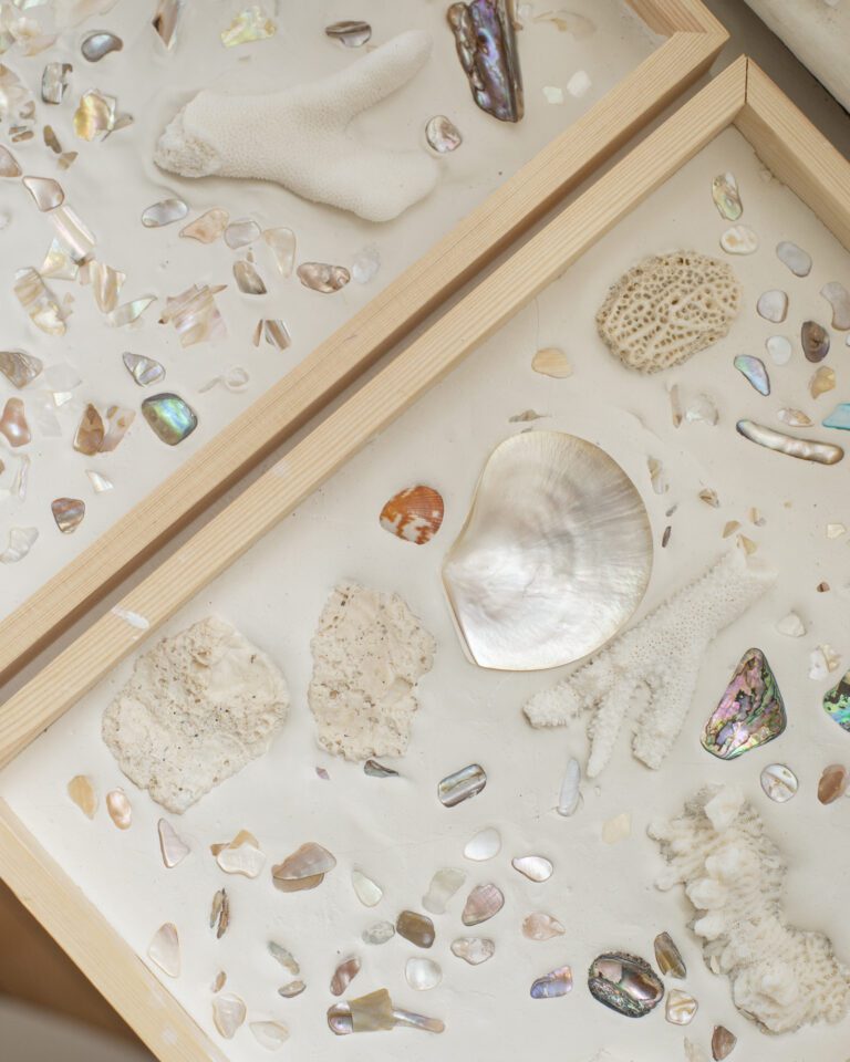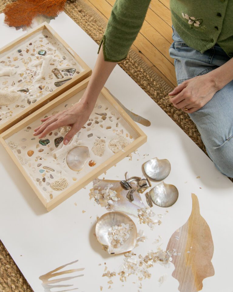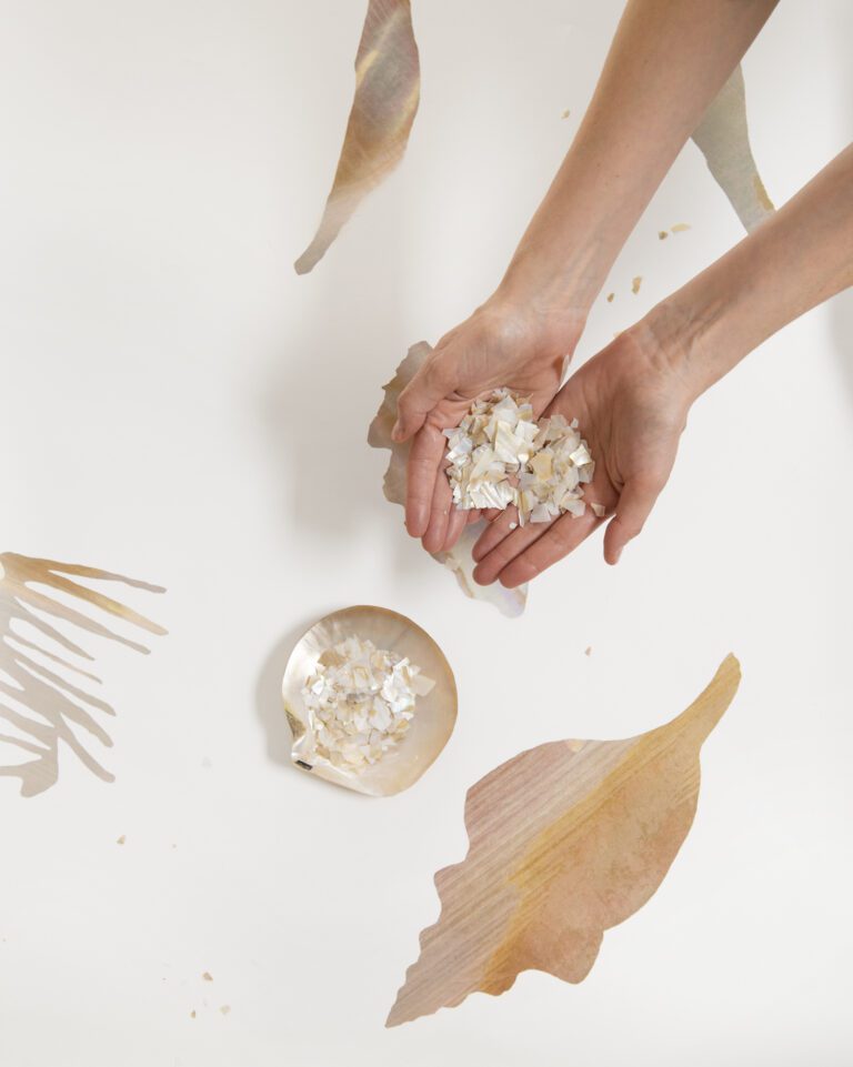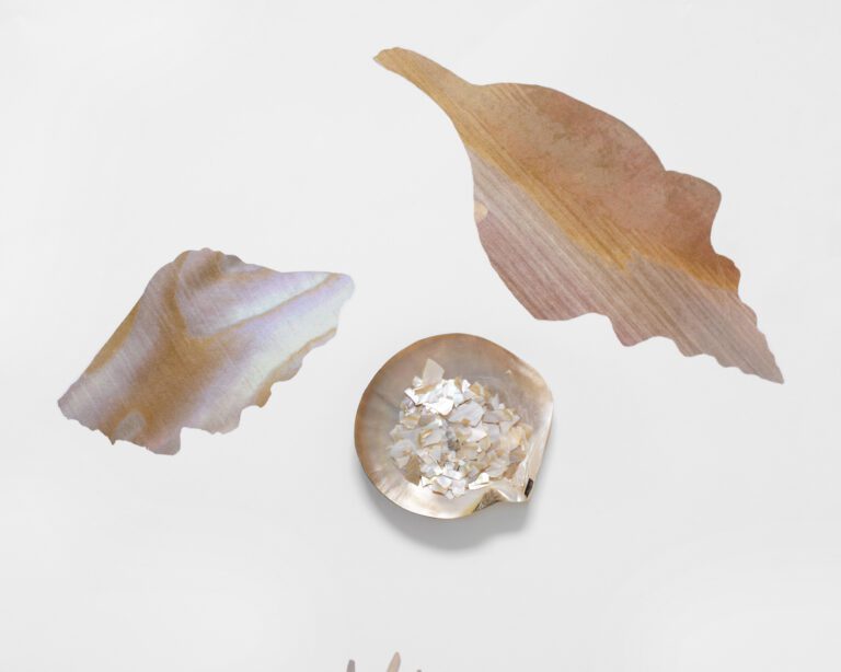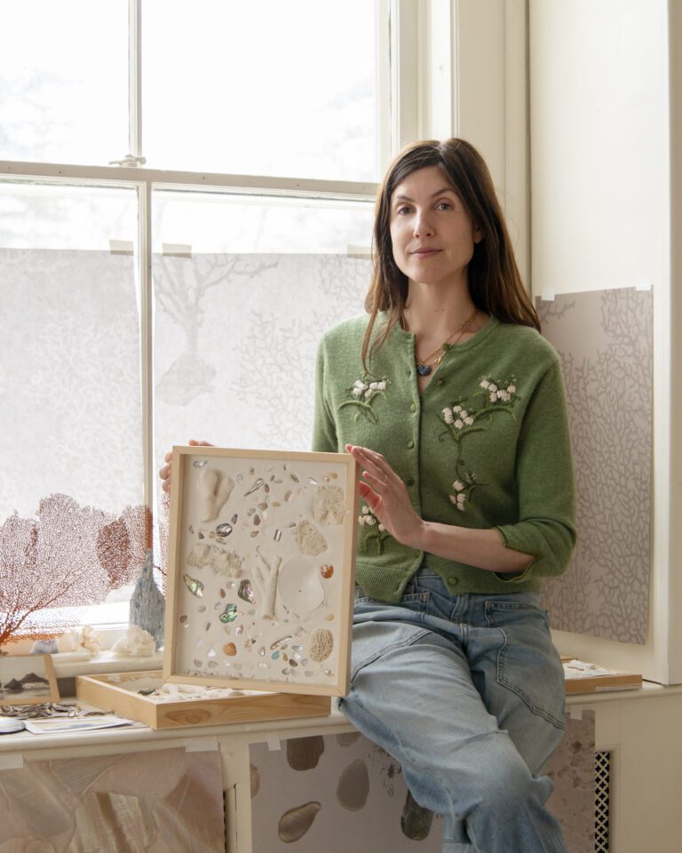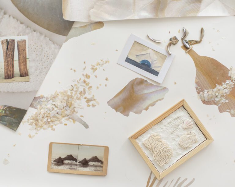 At Calico Wallpaper, we sought to capture this ephemeral beauty by working directly with nature’s materials. Using abalone shells and coral fragments, we created intricate, hand-assembled collages, layering organic textures and iridescent forms to reflect the delicate artistry of the sea. Transformed into wallpaper, these compositions preserve the movement and luminosity of their natural origins, embodying the poetry of the ocean—shells cradled in the palm, coral shifting with the currents, driftwood, seafoam, and the quiet shimmer hidden within an oyster’s depths.