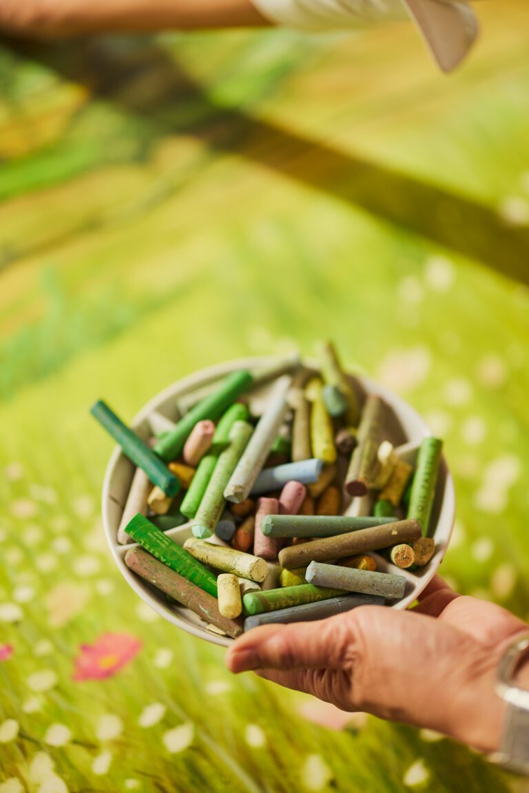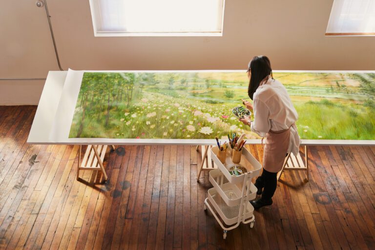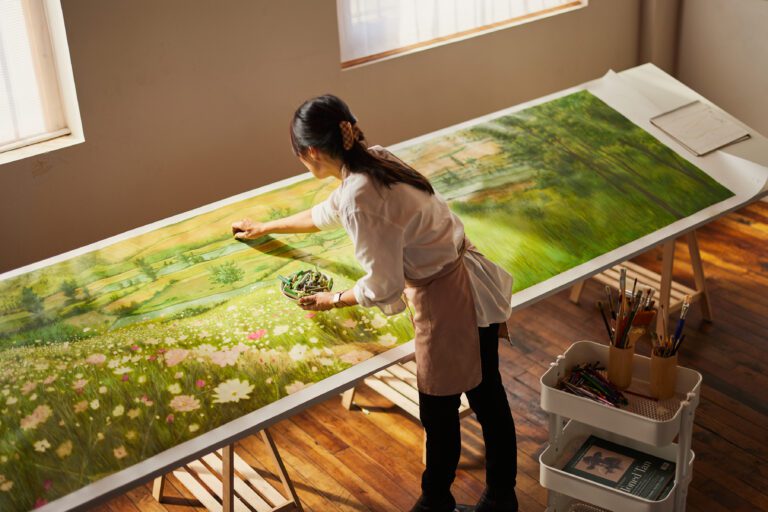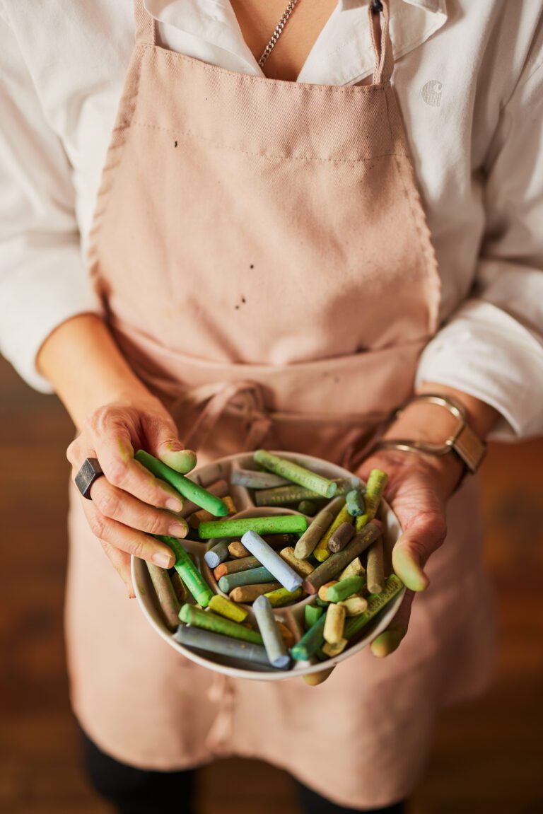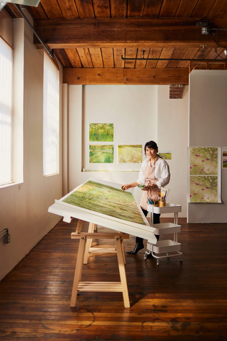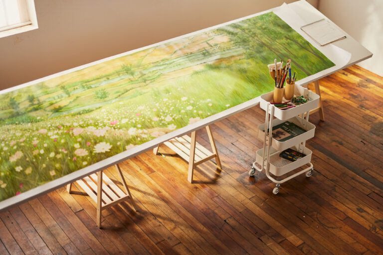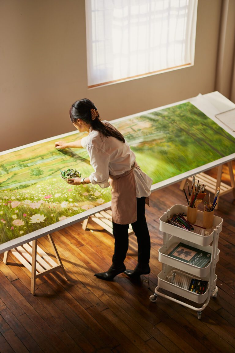 Jean created the landscape drawing for this collection using oil pastels, a medium that she often used as a child in South Korea. It is based on her father’s old photographs and reconstructed from her most vivid memories of a faraway home. The tall flower beds of pink and white cosmos that lined the walking paths, the swaying grassy green hills where she used to play, and the dense pine forests that she would wander into as a child envelope you in an expanse of rich textures cultivated by Jean’s memories.