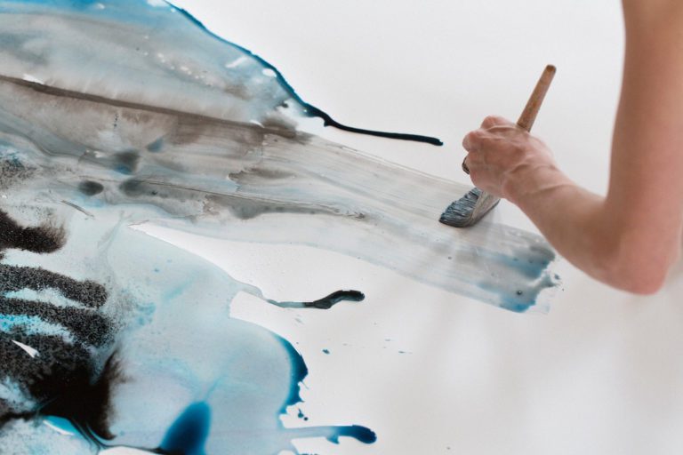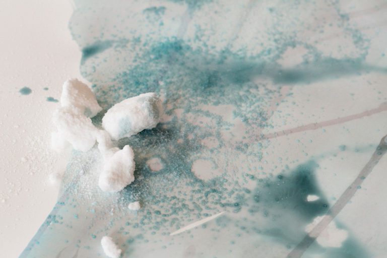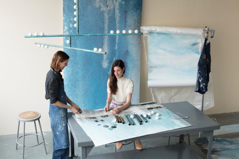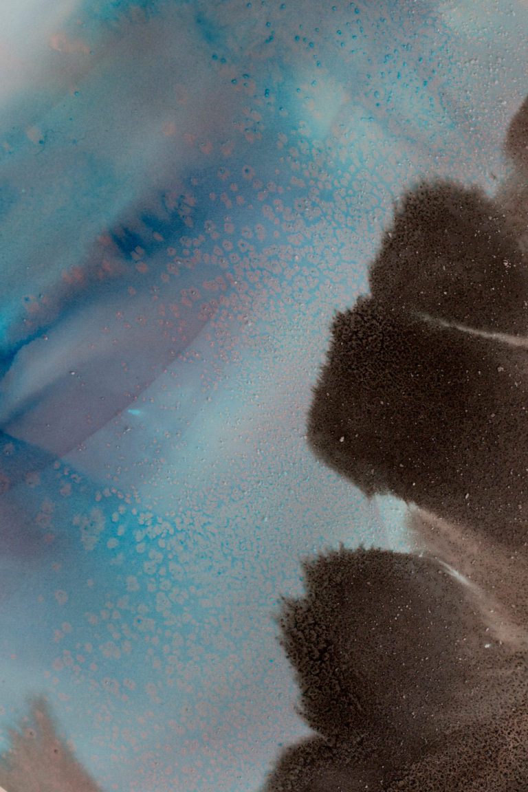 To create the collection, we worked with water’s changing states, combining techniques of submersion and evaporation. We began with a series of watercolor washes that we then scattered with salt. The salt dissolves to leave crystalline traces that capture the soft texture of the seawater.