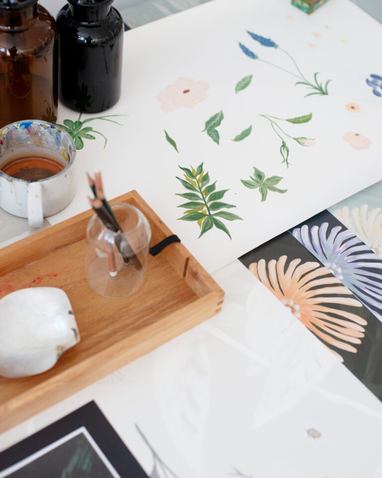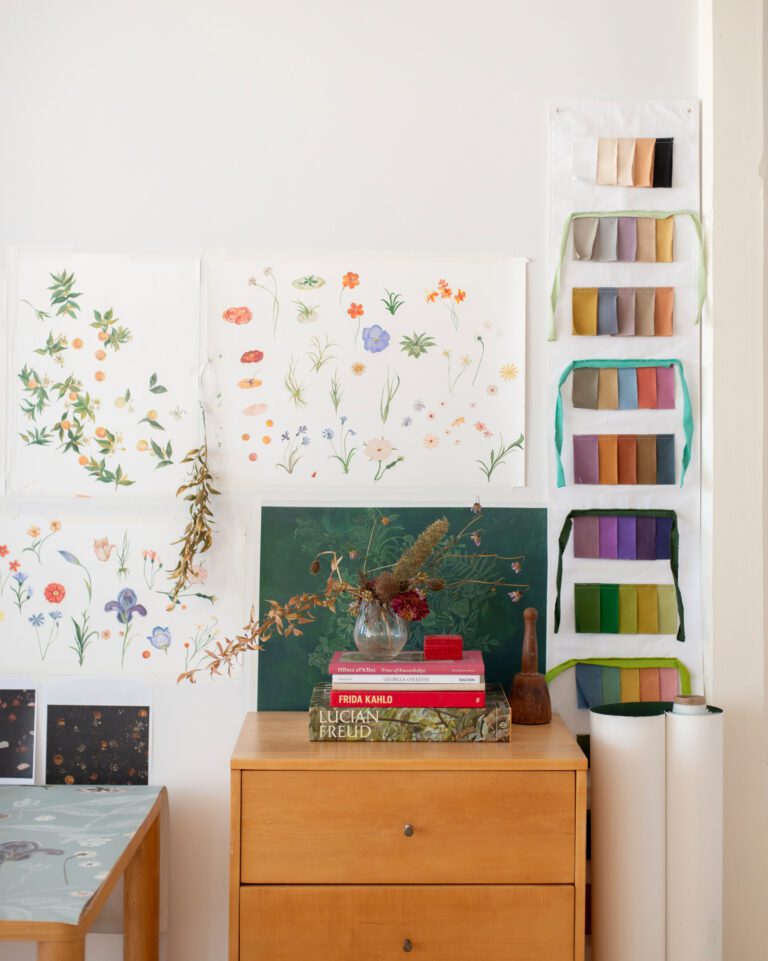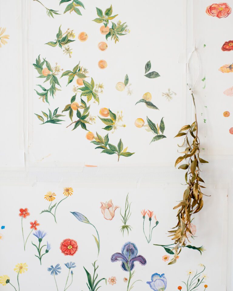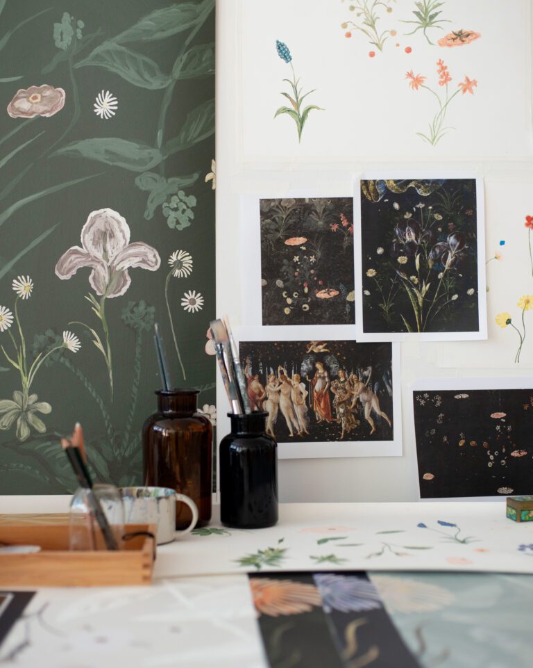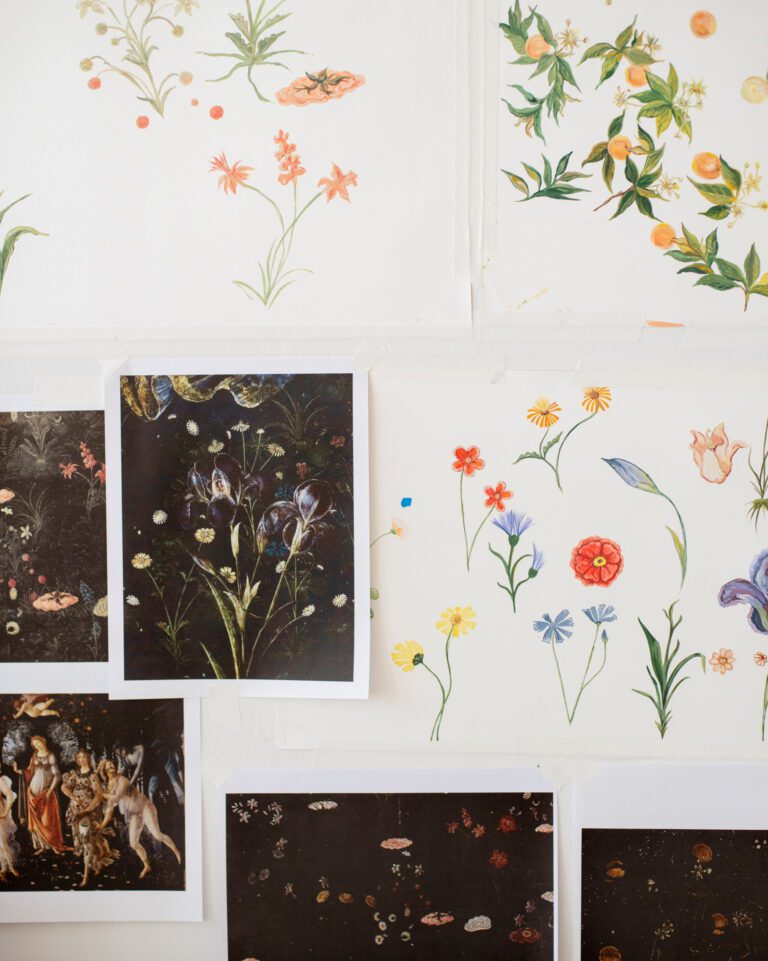 Primavera draws its inspiration from the exquisite Botticelli painting by the same name, reinterpreting the intricate botanical details into a seamless, non-repeating floral composition. The mural’s dark, layered ground evokes the depth and complexity of a lush meadow shaded by an orange grove, providing a rich foundation for the interplay of leaves, stems, and plant life.
