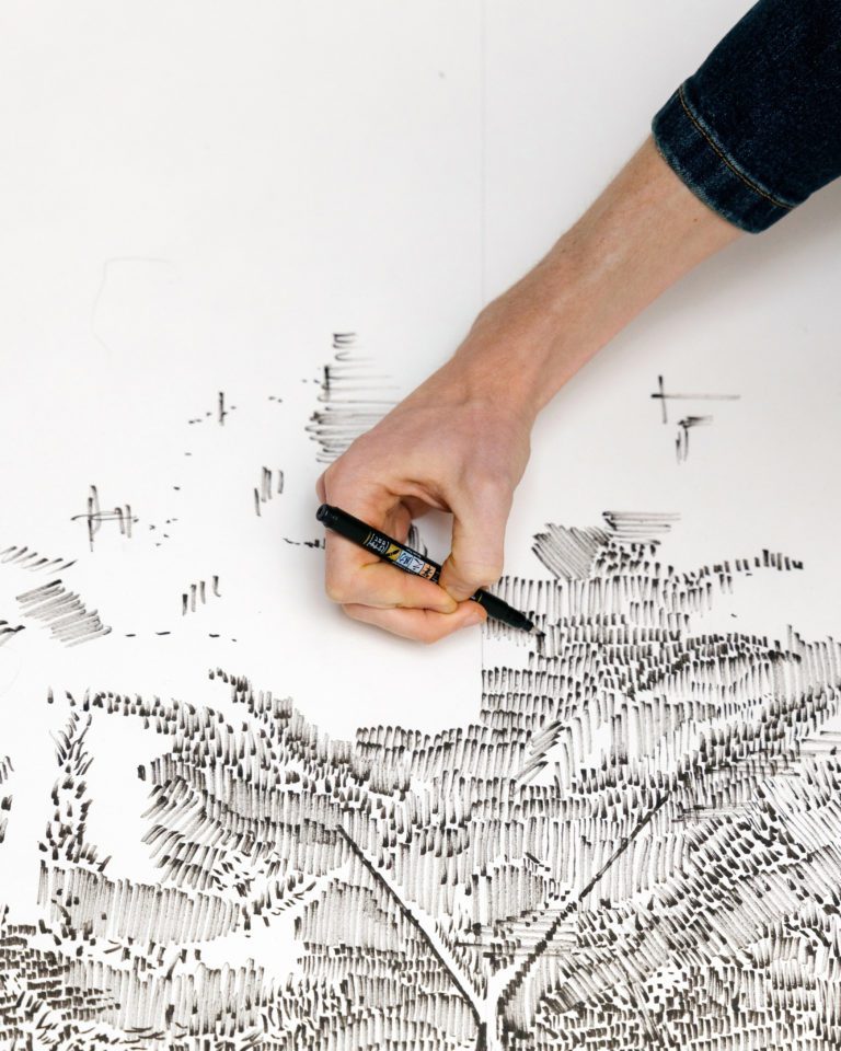 Taking the postcard’s undulating horizon and deep perspective as her starting point, Roberts reinterprets the depiction of the park using lines evocative of an architect’s sketch. With cross hatching, stippling, and a wide array of line thicknesses, her hand-wrought ink drawing combines the loose gestural quality of a painted brushstroke with the precision of the micron line. Intricate yet expansive, Roberts’s design can be seen as a sort of meditation on the bucolic beauty of this urban landscape.