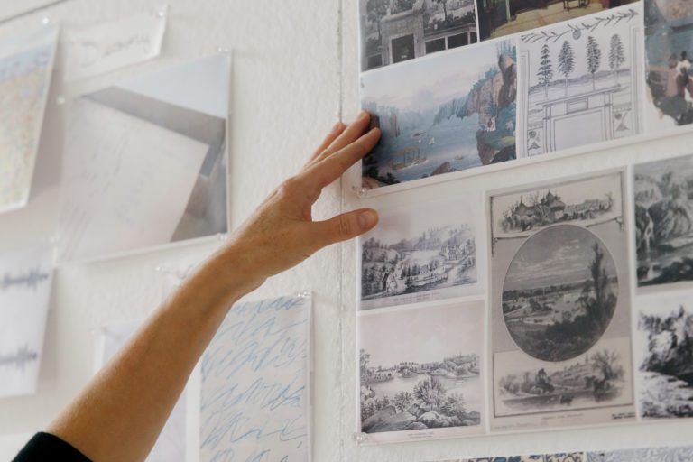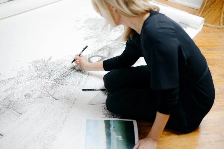 Roberts approached the wallpaper design process as she does all of her projects, by looking at history and context. To begin, she and her team scoured archives for the earliest examples of wallpaper, specifically the historic landscape murals found in New York’s grand dining rooms before the invention of repeat-printing technology. What they found were beautiful botanical scenes—and abundance of exoticism, especially Chinoiserie. “Back then, there was status in showing scenery from far-off lands,” says Roberts. “We wanted to celebrate something more local, to showcase the beauty in our own backyard.” A 1910 postcard of Prospect Park, the Frederick Law Olmstead–designed centerpiece of Brooklyn, where Roberts both lives and practices, became her inspiration.