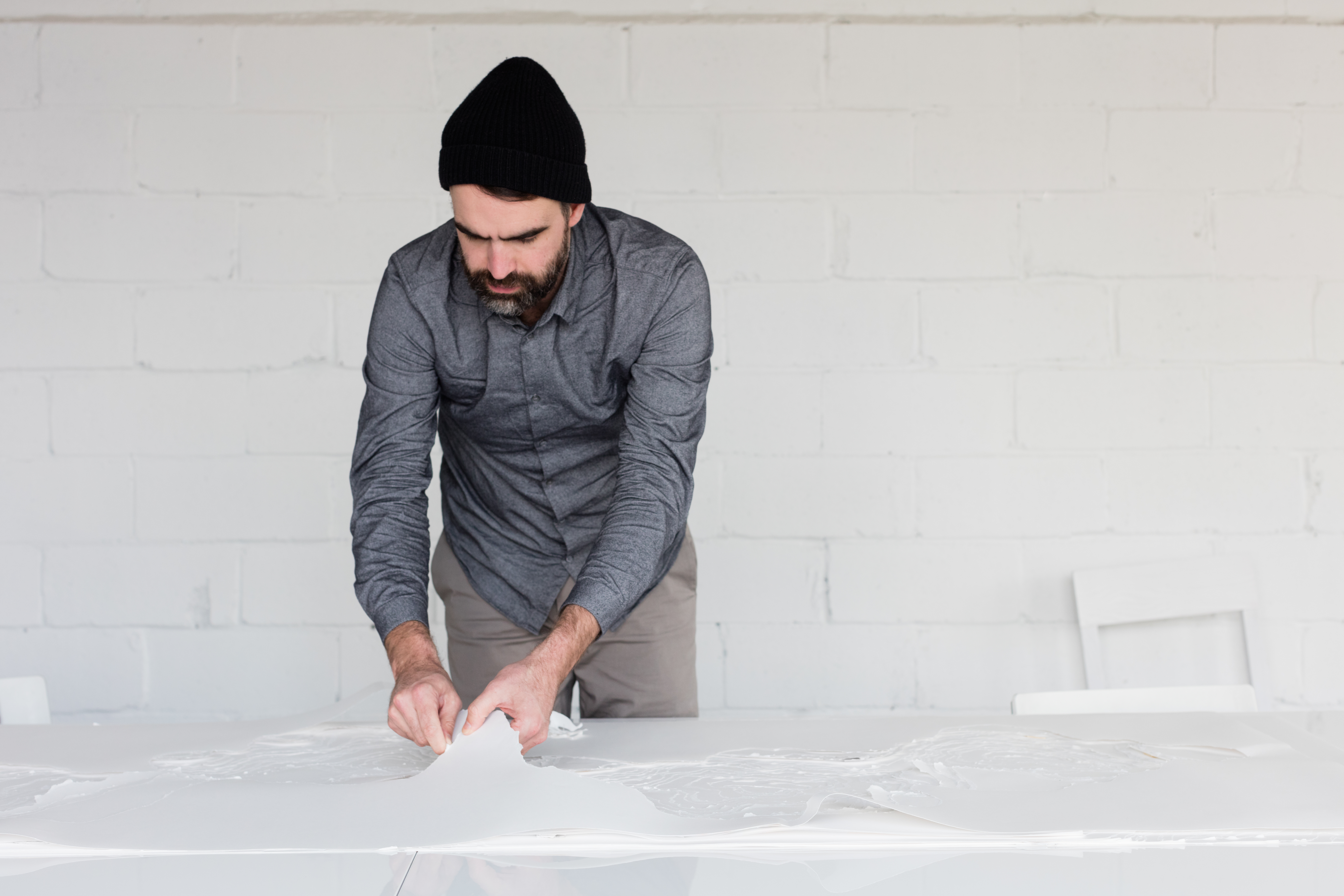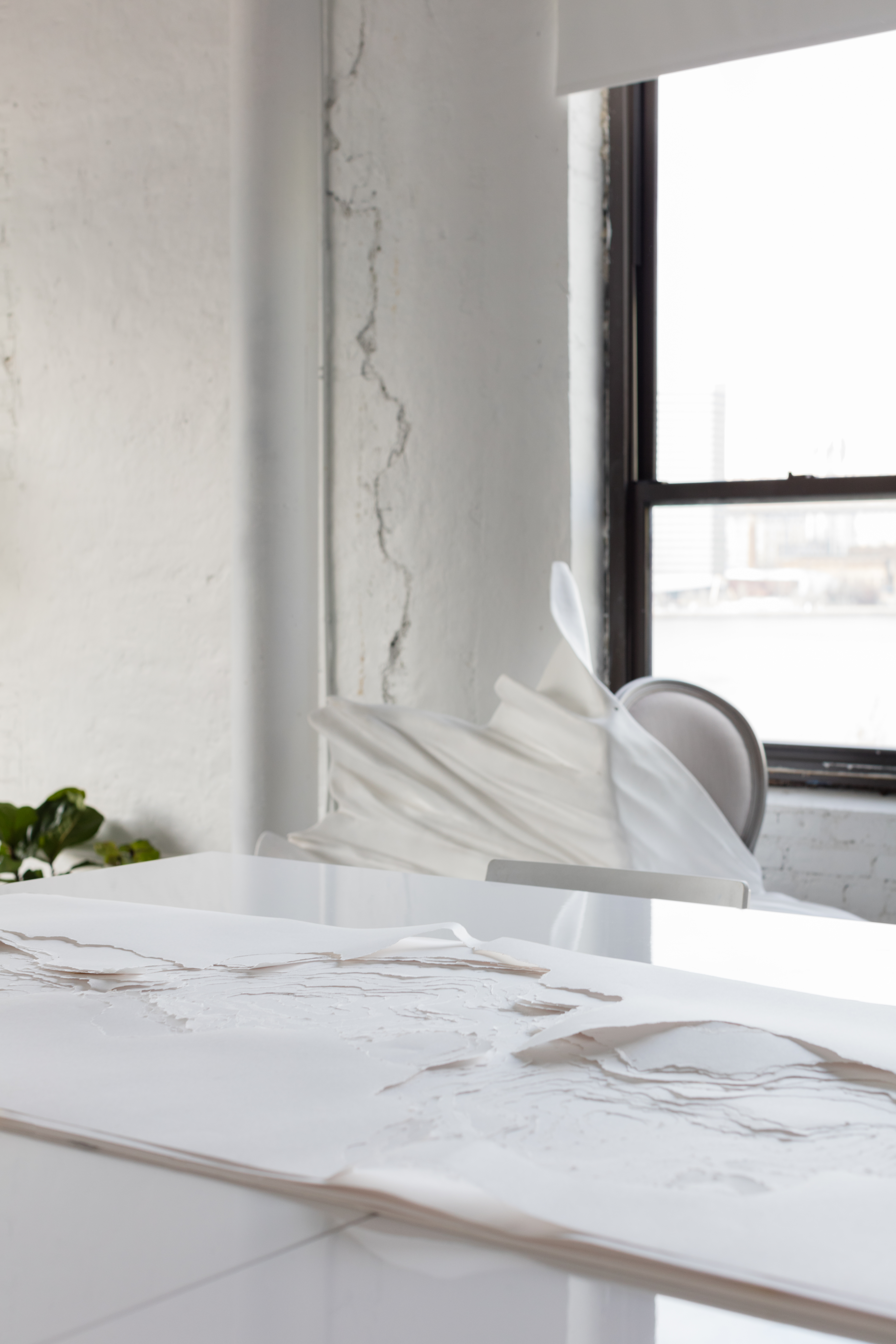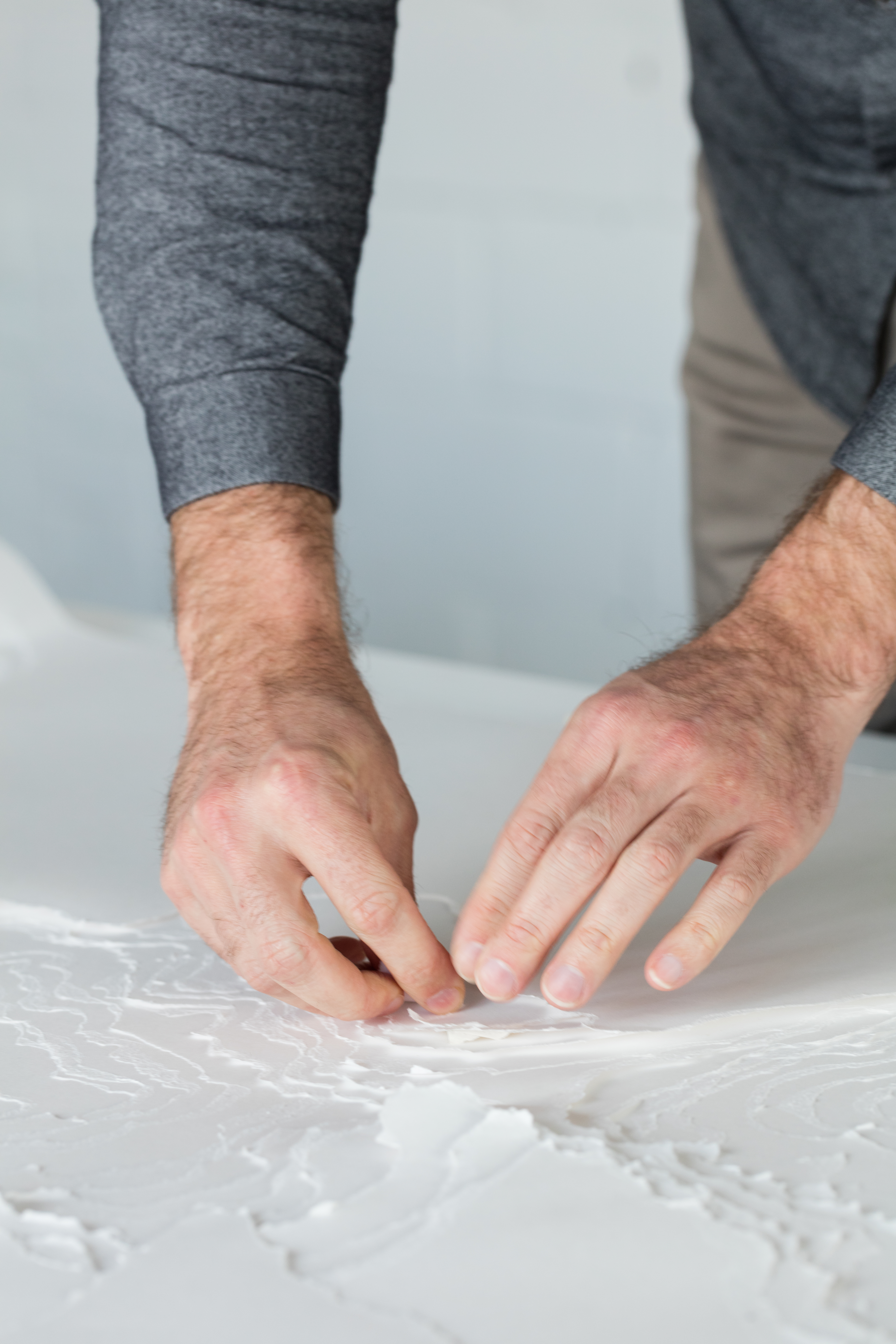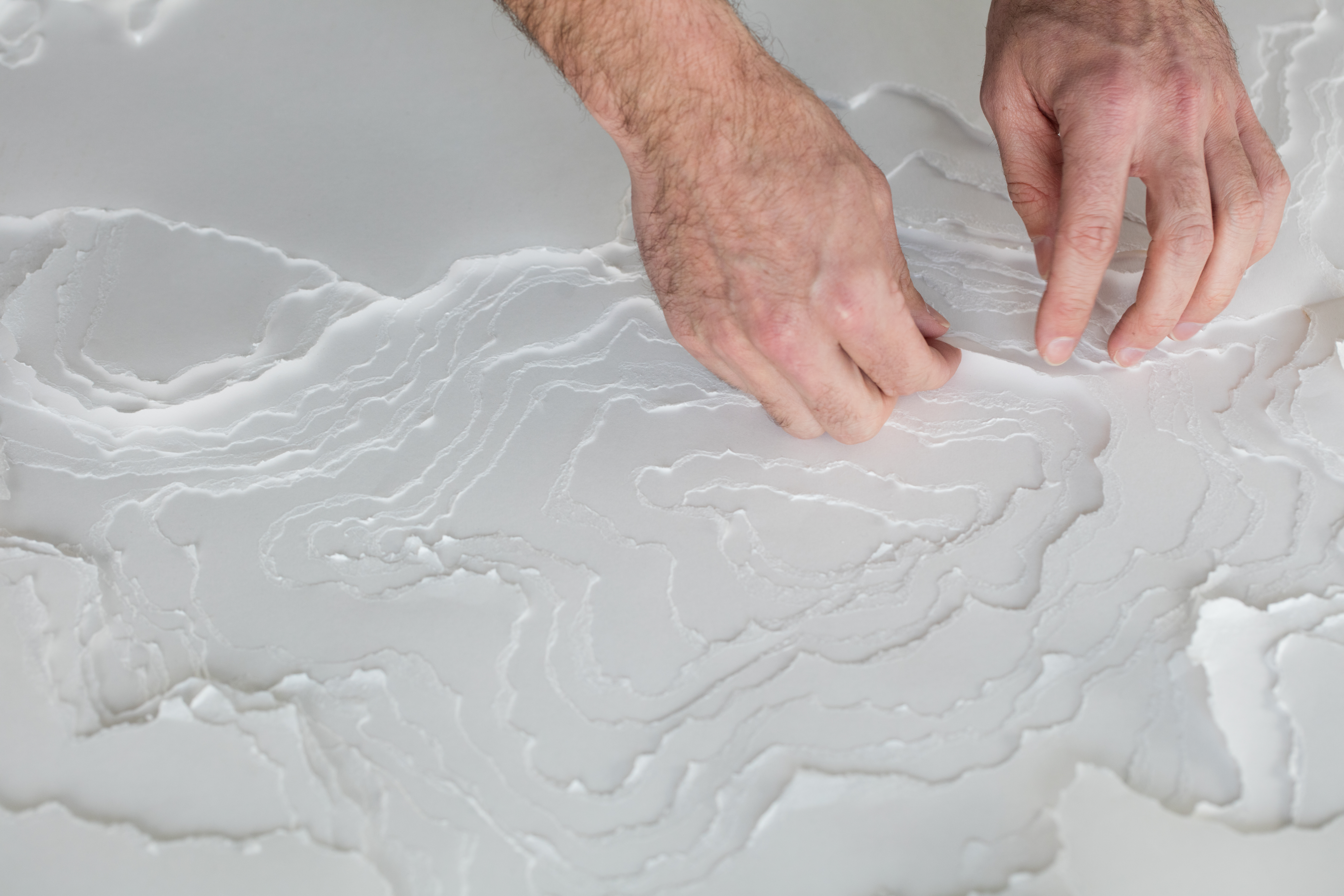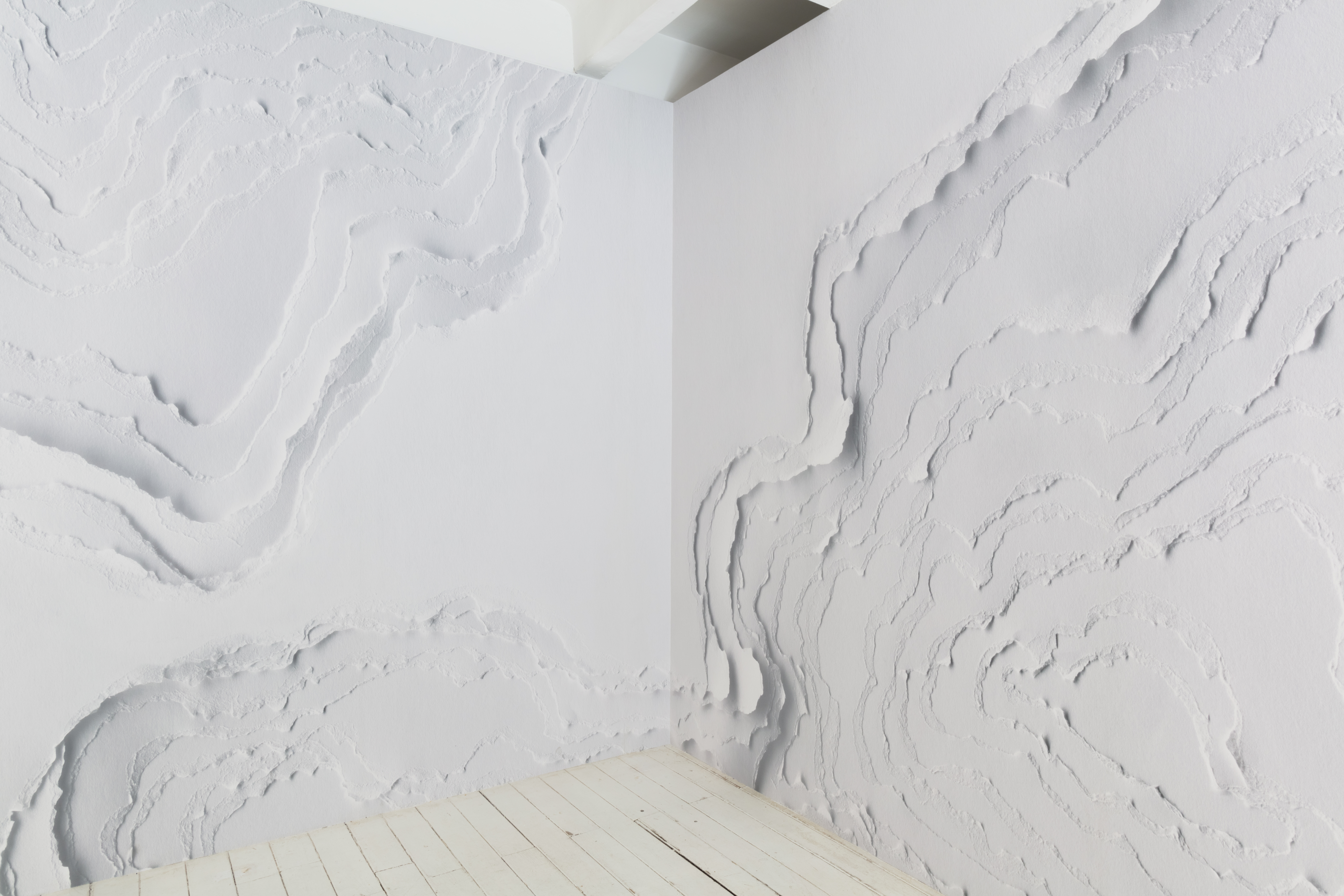 Building on Snarkitecture’s exploration of excavation as an architectural process, Topographies transforms a three-dimensional exercise into a two-dimensional wall covering. Stacks of paper were torn by hand to reveal a stepped topography, implying an unknown architectural depth within the image. The textured contours play between the looseness and depth of the torn excavations and the prevision and flatness of the wall surface. Alluding to the aging process of layered wallcoverings, Snarkitecture’s design reveals an unexpected relationship between destruction and construction.