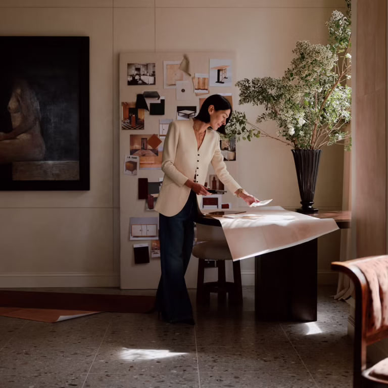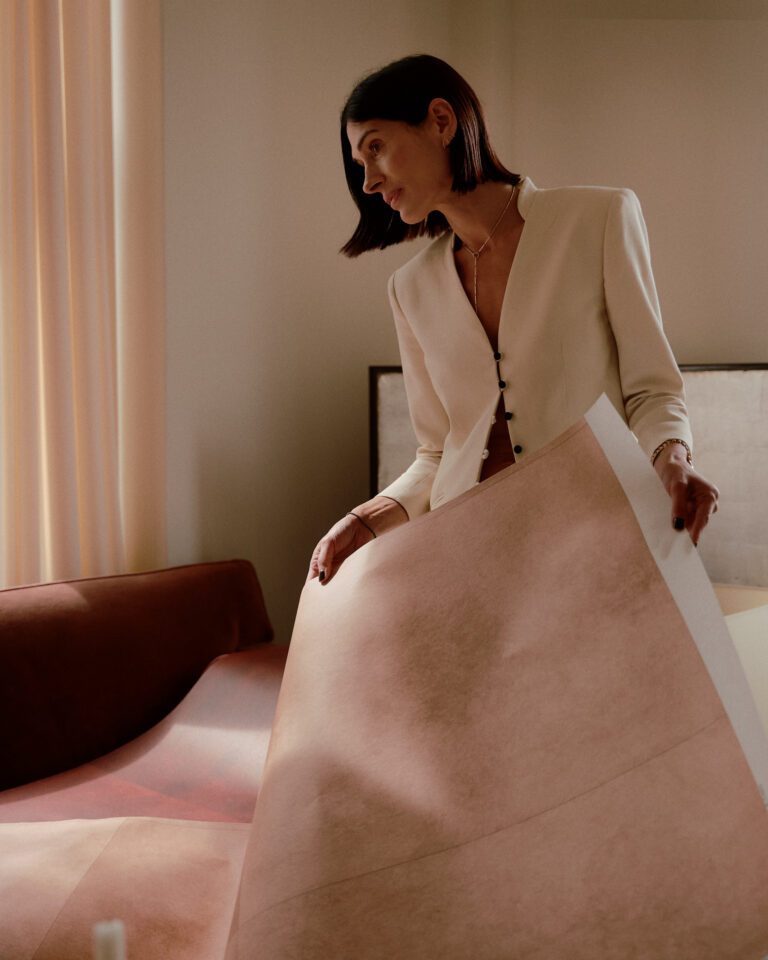 Working alongside Rachel Cope, co-founder and creative director of Calico Wallpaper, Calderone enlisted a French artisan to hand-render delicate layers that, when digitized and overlaid with authentic material scans, became something that feels both ancient and startlingly new.