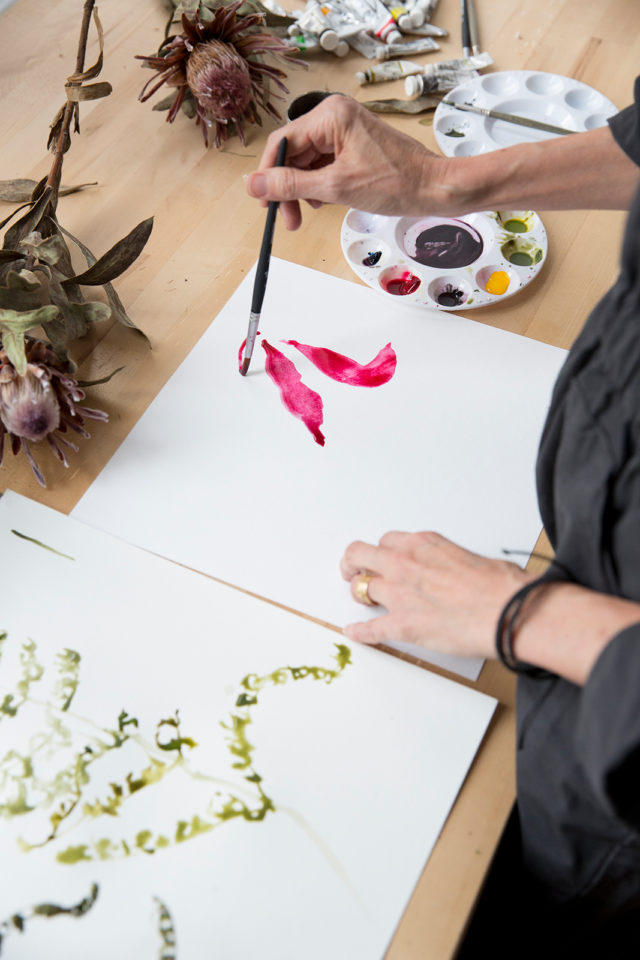 Surrounded by towering cliffs, bluffs and tempestuous crashing waves, her simple house sat on a jut of land that opened to a narrow path. Every day, she set out to collect flowers, seeds, and weeds, bringing them back to her makeshift studio where she transformed them into effortless watercolors that now make up the collection.