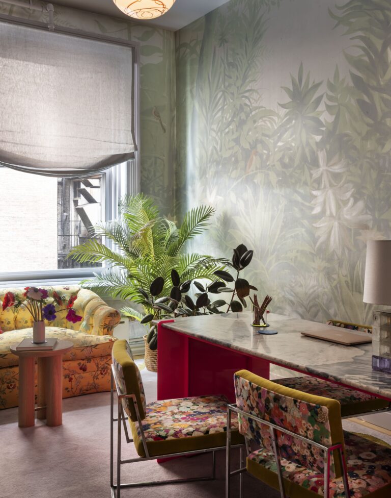 The office’s pièce de résistance is the screening room, a luxury to have in-house, made all the more so by Studio DB’s incorporation of vintage Carlo Scarpa theater chairs (sourced at auction from Rome), some of which are upholstered in a House of Hackney floral with lumbar pillows in a Dedar fabric. “Projects like this are really fun for us, because we get to learn something new,” says Zunino.
