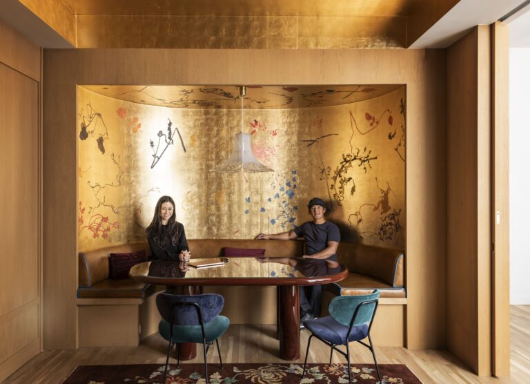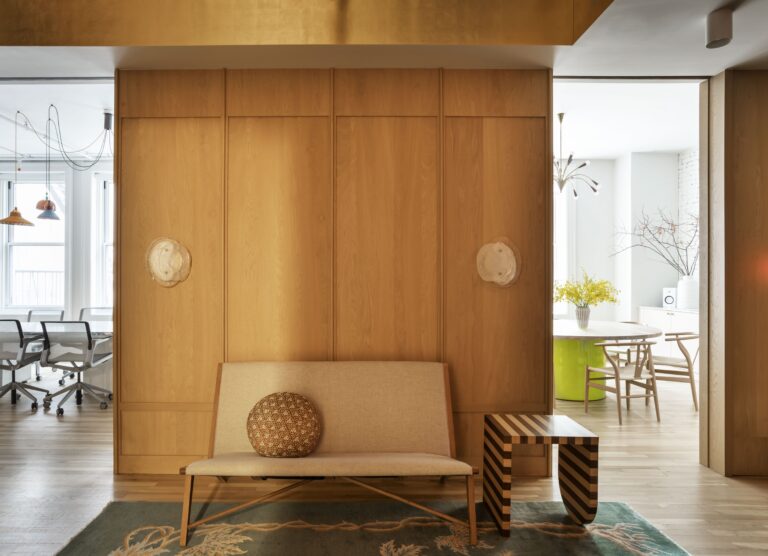 The 7,000-square foot space marries both filmmakers’ aesthetic proclivities and ties them up in a sophisticated bow. As soon as you step inside the wood-clad entry hall (the panels elegantly mask equipment and storage), you are greeted by a custom-built banquette, whose gold wallpaper backdrop conjures the sheen of an Oscar statuette. Glass-paneled pocket doors allow light from the exterior rooms into the central spaces, while furnishings have a more residential feel. Corridors are lined with posters and ephemera from the studio’s projects, while other upcycled materials—like repurposed stone tabletops and seating upholstered in unused fabric remnants from the couple’s apartment—also make an appearance.
