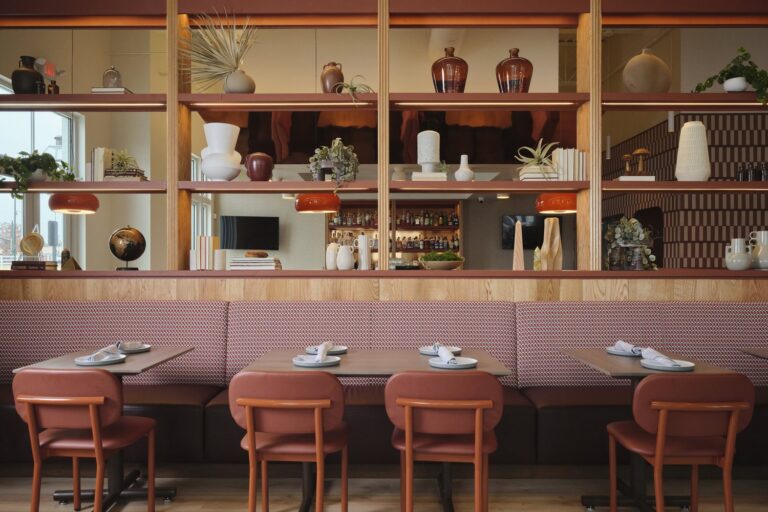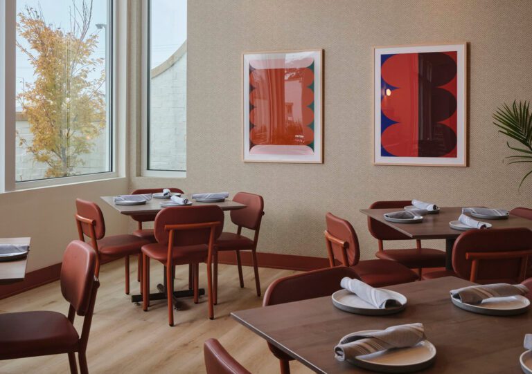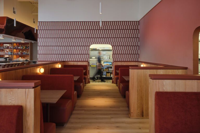 We are in love with Collect + Curate Studio’s design of SOB, a new restaurant in Collierville, Tennessee. Inspired by the adventurous menu, the bold, postmodern interior features graphic color-blocked tiles, terrazzo, abstract shapes, and asymmetry. Swaths of warm monochromatic colors and architectural details like asymmetric restroom vanities and arched doorways add to its charm.