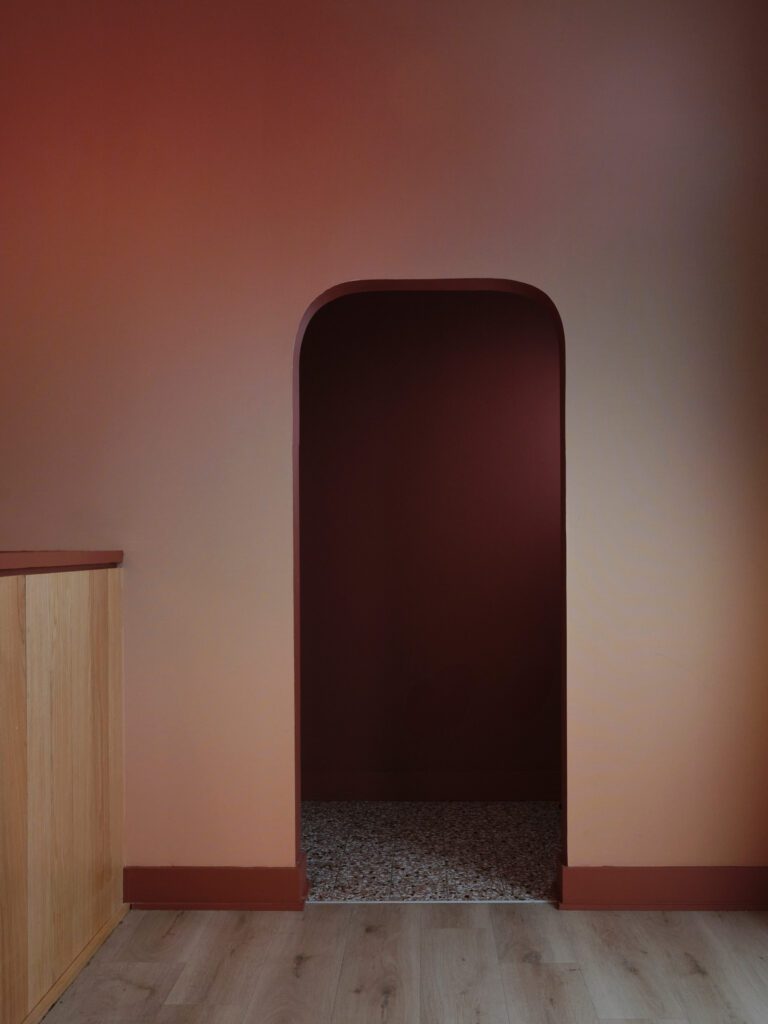 Our Aura mural in the Mula colorway wraps the walls, creating a dreamy ambiance to the modern setting.