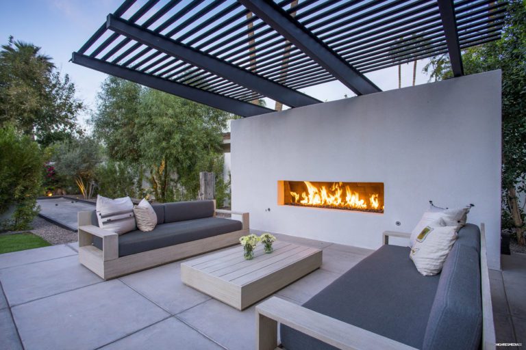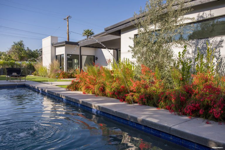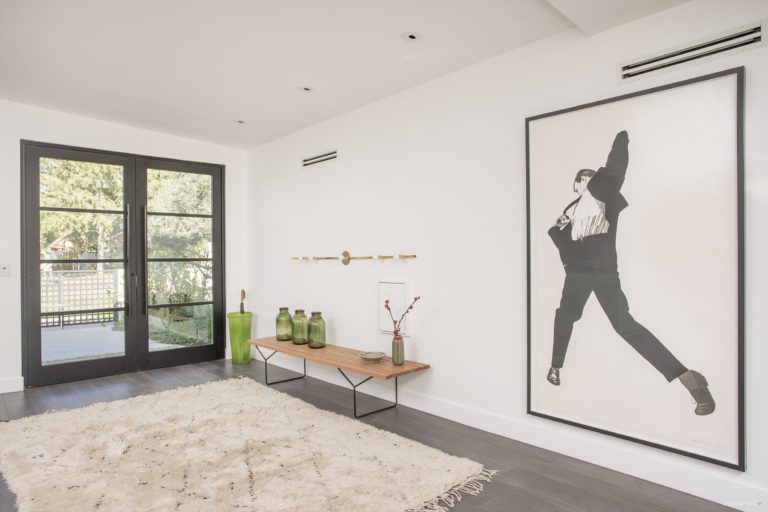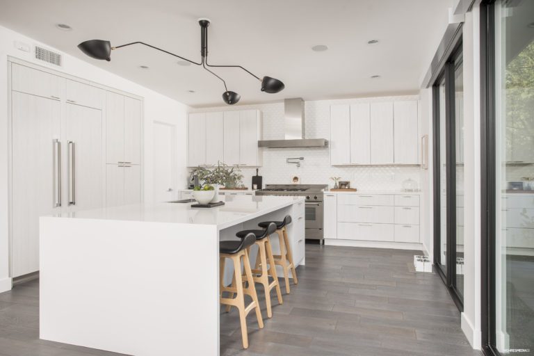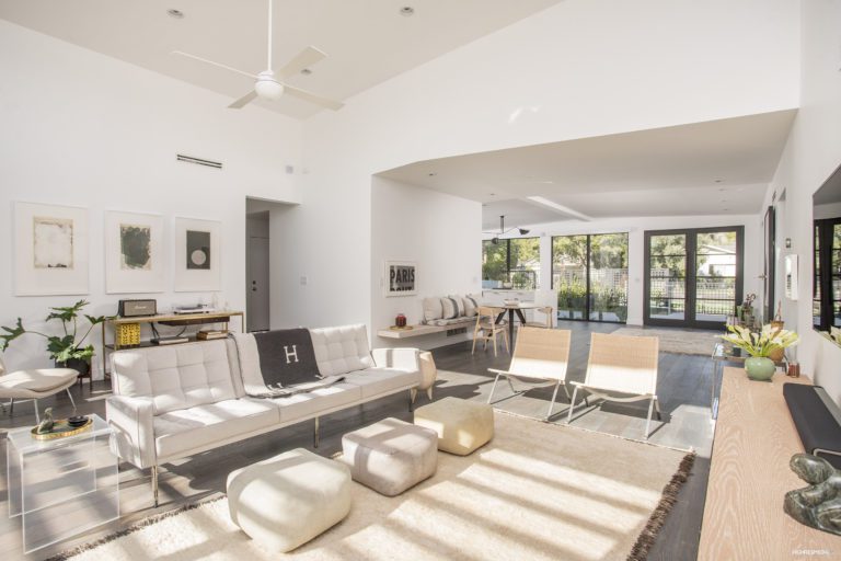 In the middle of the desert, Helene Corneau-Cohen of Corneau et Filles created a little oasis of her own. Corneau-Cohen designed a small, bright, and happy desert home in Arcadia, Arizona. The goal was to create a green and lush garden that could feel part of the decor; where the outside and inside are one. Perfect for entertaining and relaxing, the sun-washed home is filled with silvery green, beach woods, and lots of white and grays making Inverted Spaces in Ursa an obvious choice for the space. An overall clean and simple design of the home allows for fun moments like this Inverted Spaces accent wall in the powder room.