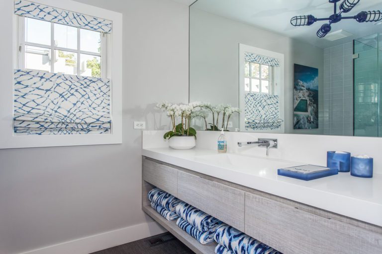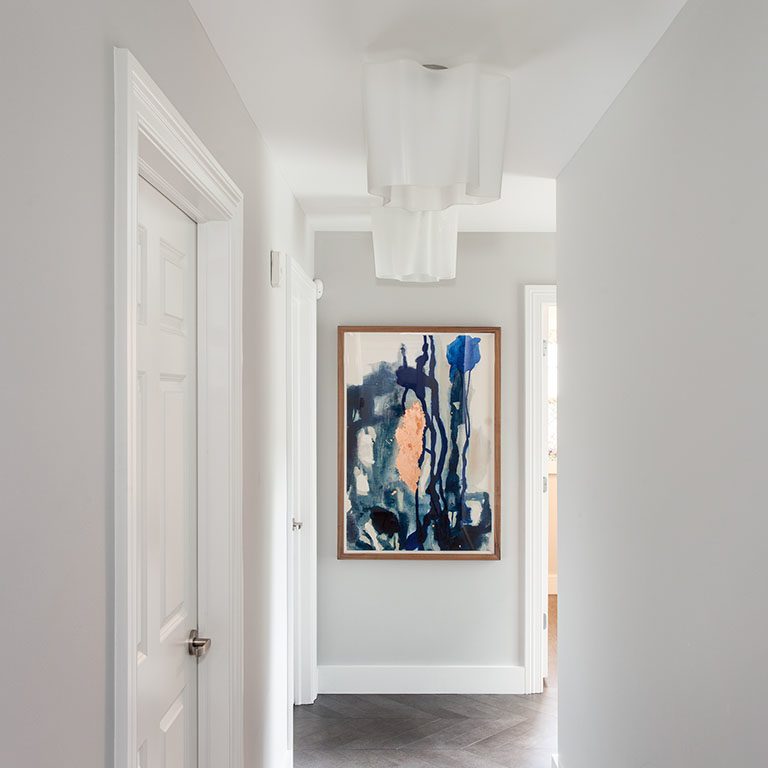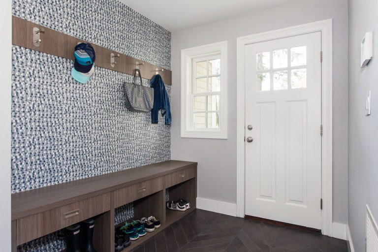 Lisa Tessler of Link Interiors worked on this beautiful home, creating a “fun and beautiful dining space” with the help of Calico Wallpaper. For this dining room, they strove to think outside the box, using the Aurora in Well wallpaper as their launching point. The ombré coloring was love at first sight, and they knew it would give the dining room the interesting ‘wow’ factor they hoped to create. We are so happy to share the space with a chandelier by our friends at Pelle and custom brass-inlaid walnut dining table from New Day Woodwork, amongst others. The designer loves the combination of walnut with the deeply rich wallpaper, instilling a warm and inviting room.
