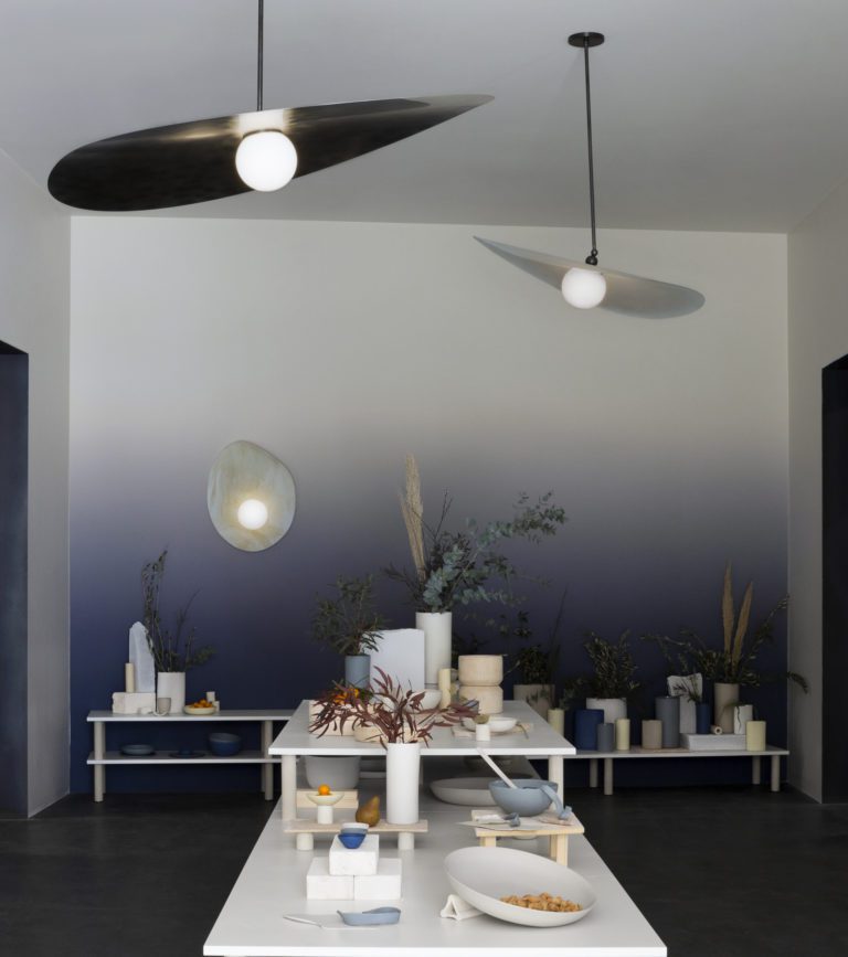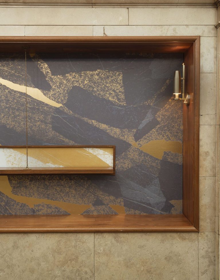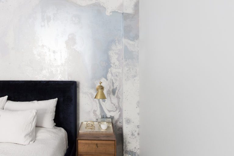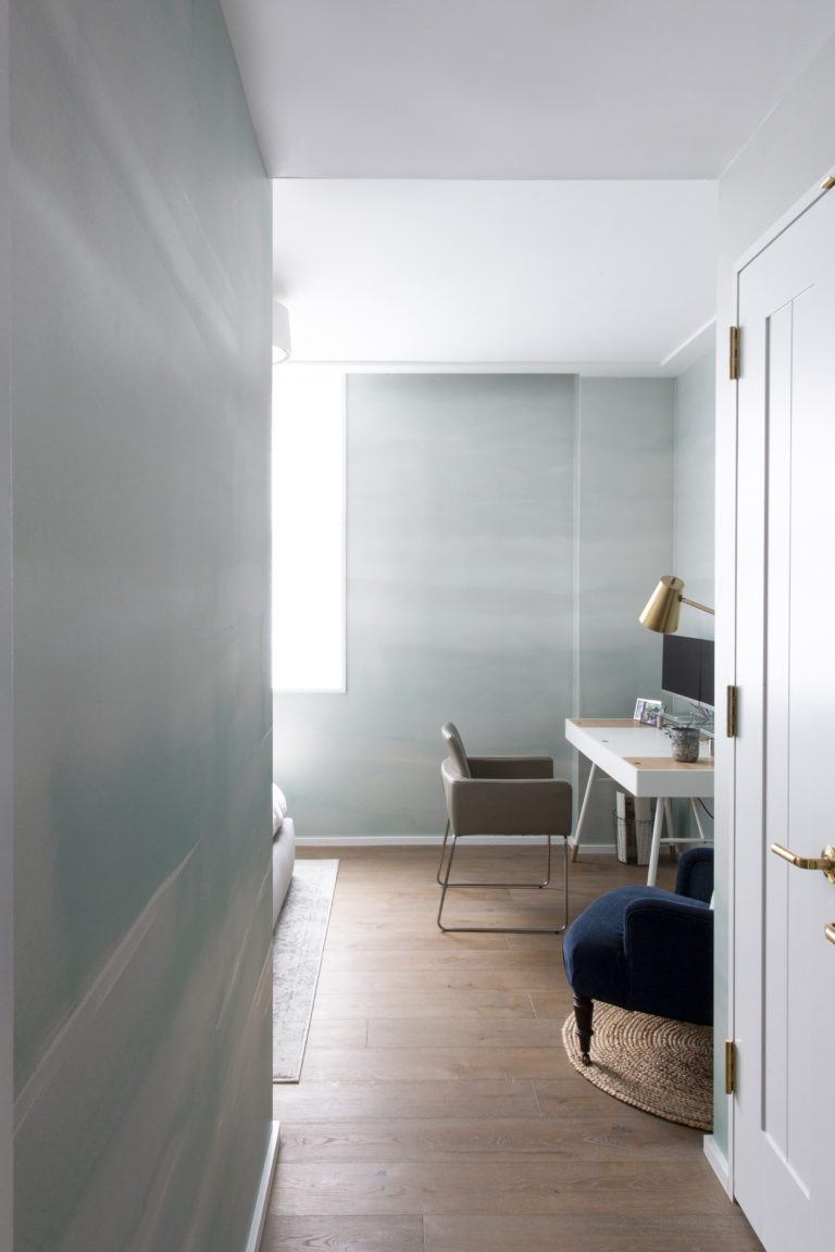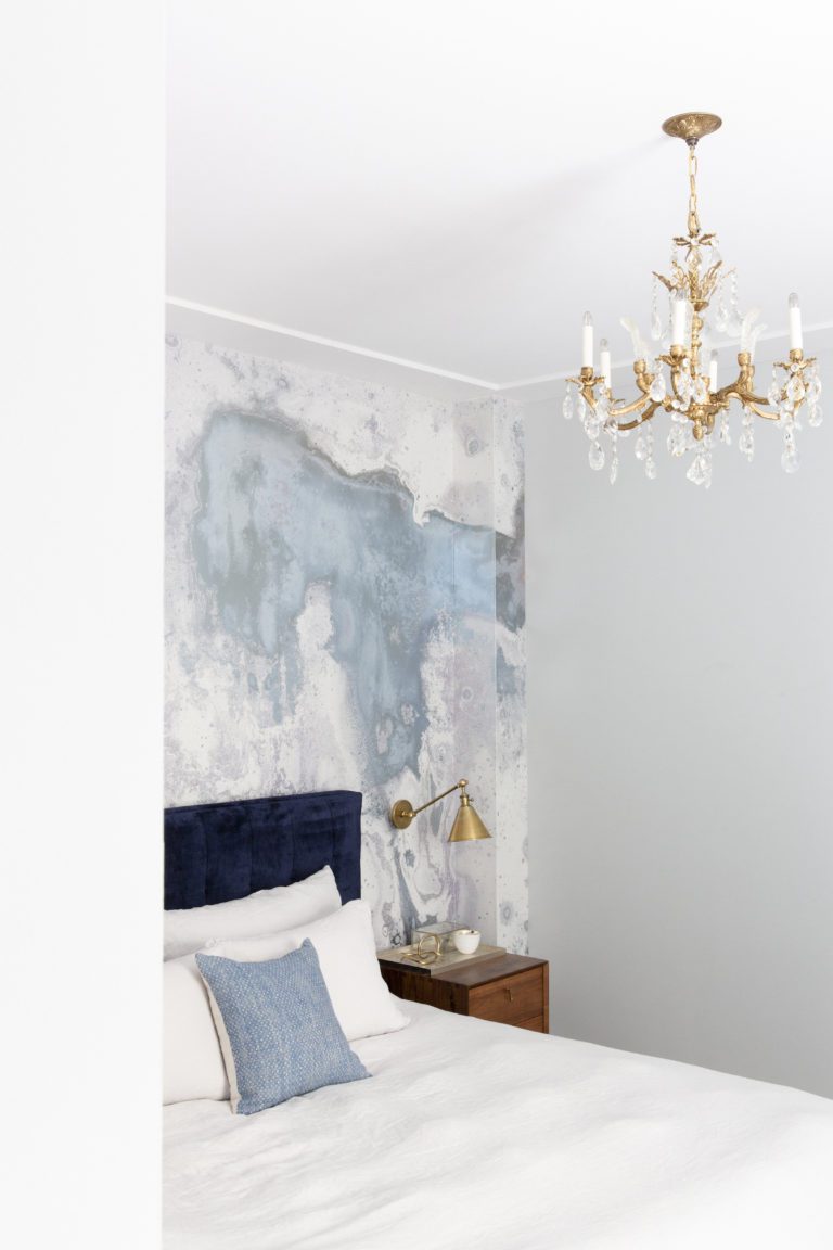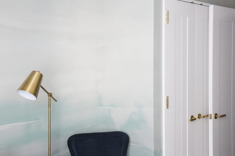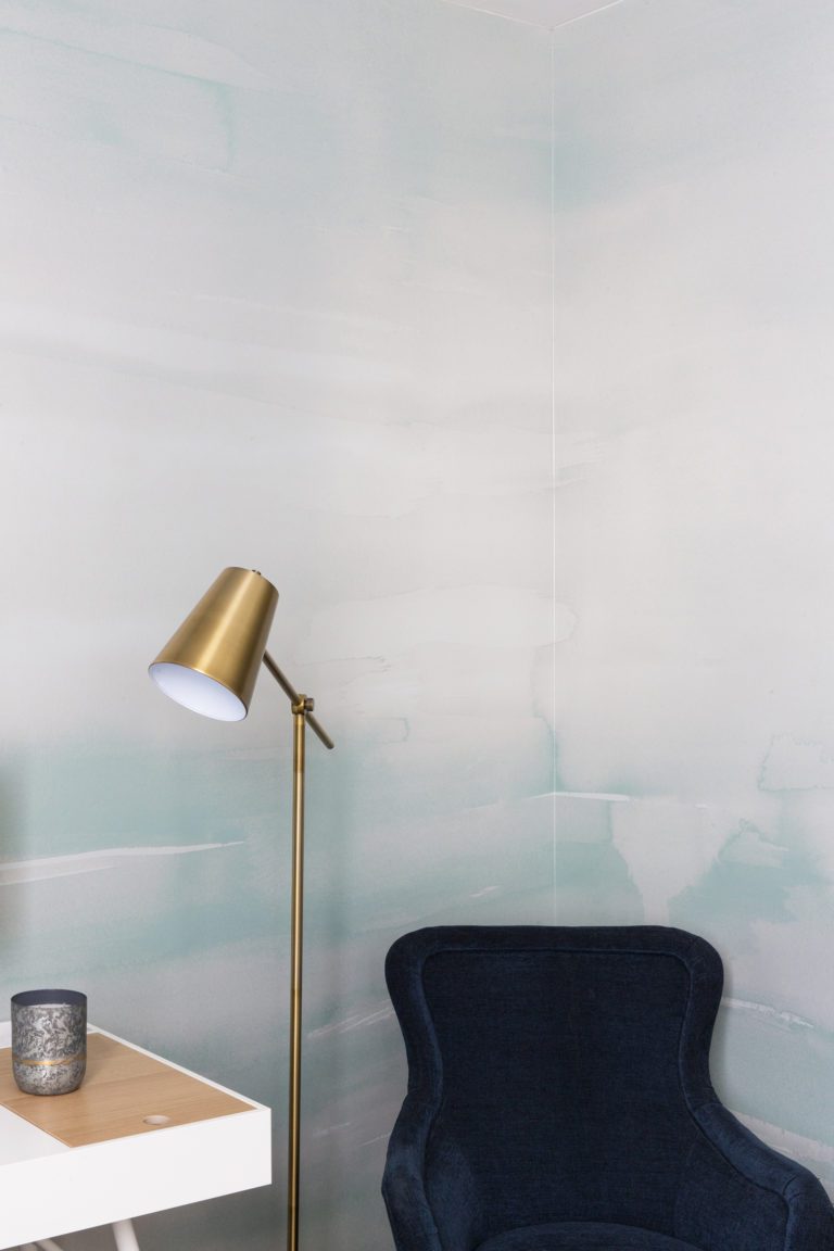 Many Calico Wallpaper Collections reside in a client’s home at DDG’s The Standish. Our hand-painted Fragments in Azurite is stretched and mounted on display in the dining space. Cirrus in Vapor wraps a bedroom. Inverted Spaces in Ursa accents the backboard wall of another bedroom.