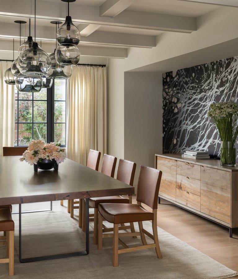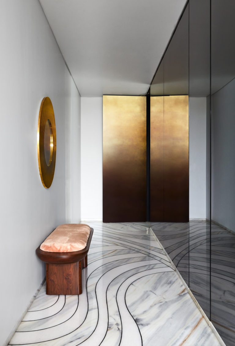 In the master bedroom, the designer created a warm atmosphere with white oak panels. Calico Wallpaper’s Oceania Collection in the colorway Siren wallpaper adds color to the room. Behind them are cabinets and a door to the bathroom and dressing room.