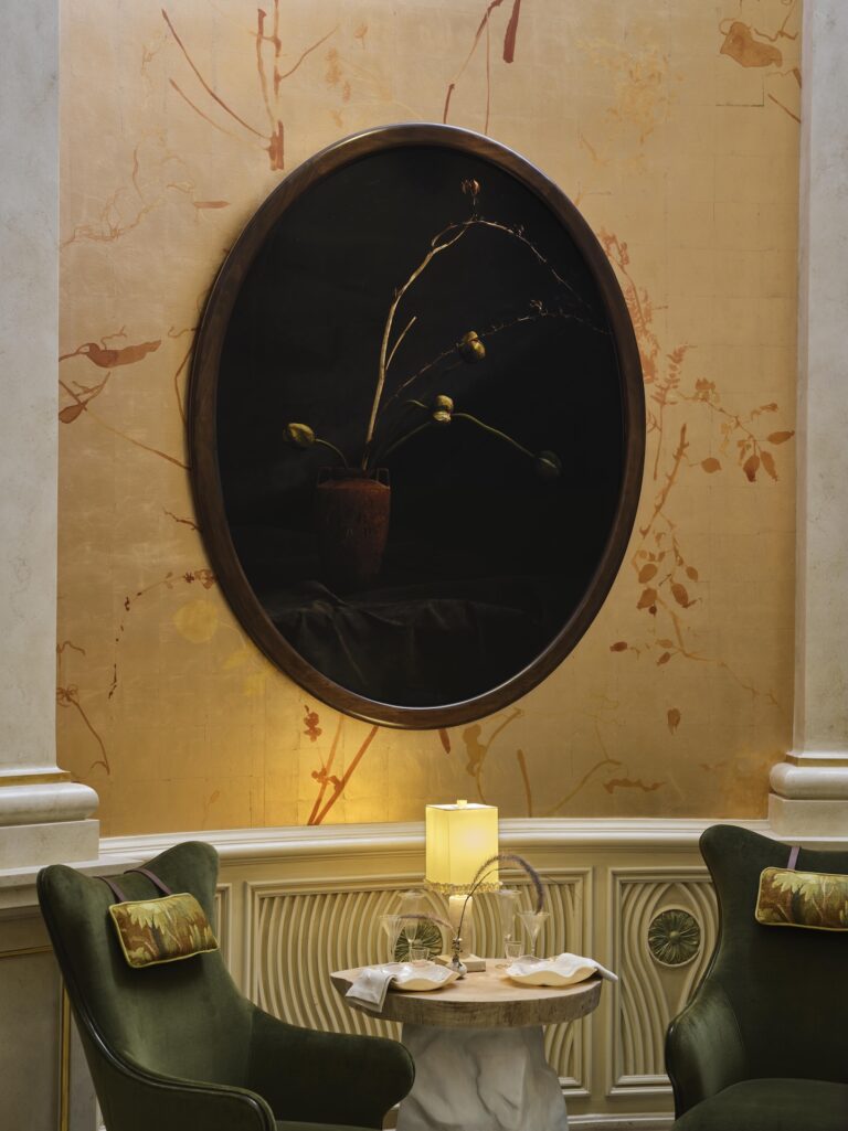 Sano and Taylor kept true to the space’s grand dimensions by creating a conservatory that would also serve as botanical-forward tea room, filled with organic furnishings, original art, and stunning floral installations that would pay homage to the verdant beauty of the natural world. The pair found a Calico mural wallpaper that would play up the scale while giving the feeling of a “botanical wonderland.”