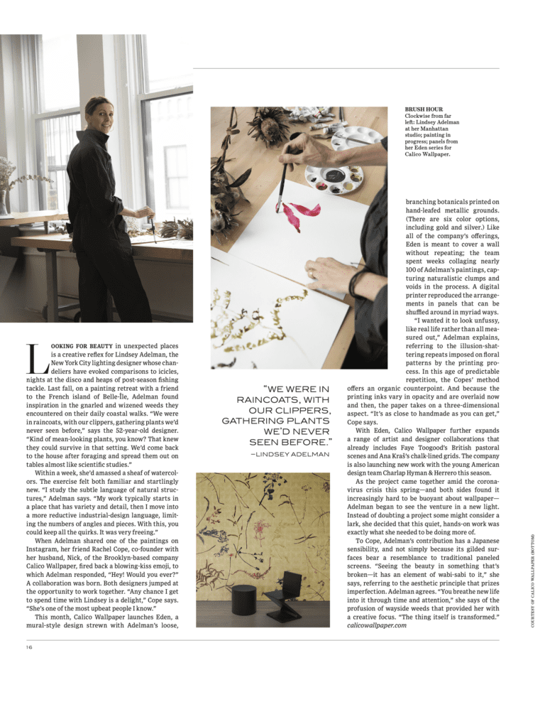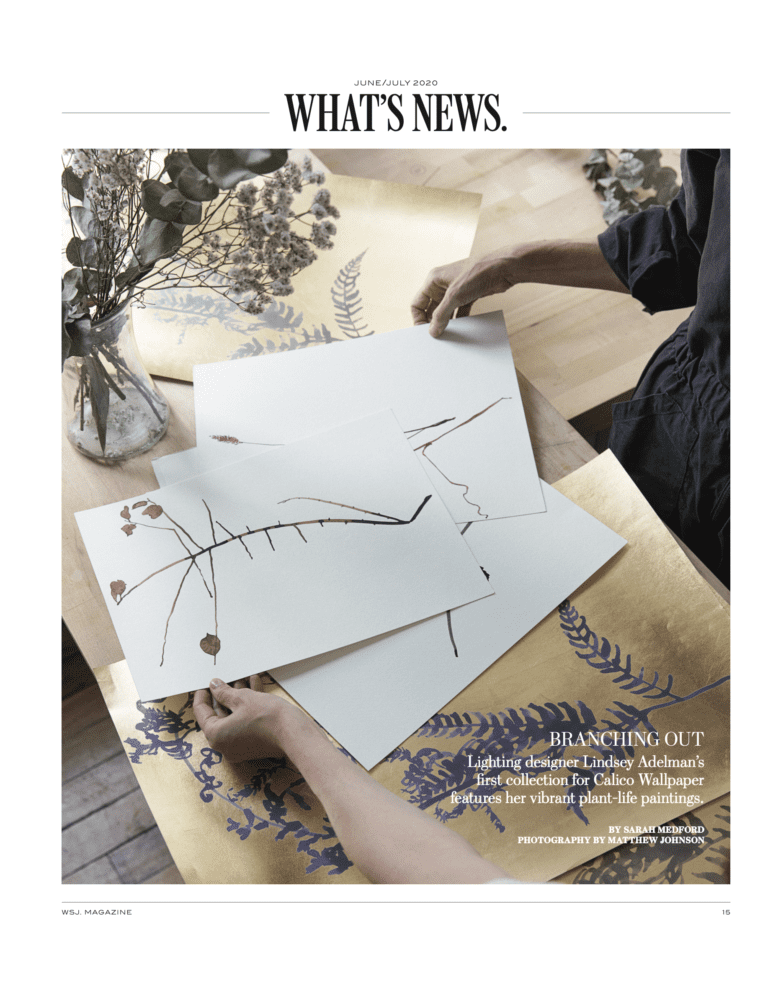 Calico Wallpaper’s collaboration with lighting designer Lindsey Adelman culminated in the production of the Eden Collection. A behind-the-scenes look at the process behind the collection was shown in this Wall Street Journal piece featured in the June/July 2020 issue of the printed magazine.